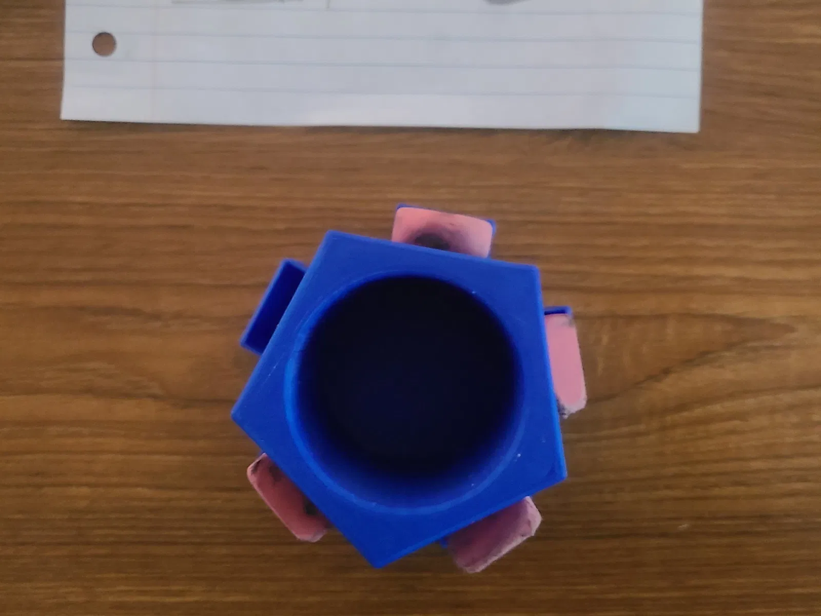 Đây là một người giữ bút chì cũng có năm người giữ cho các máy xóa màu hồng ở bên ngoài.