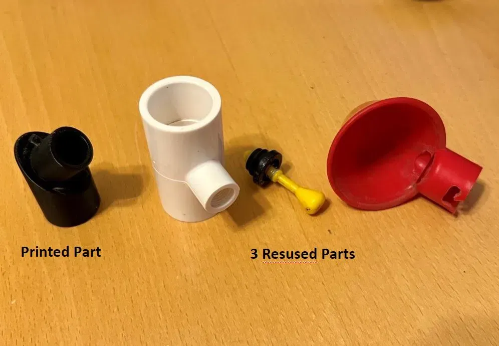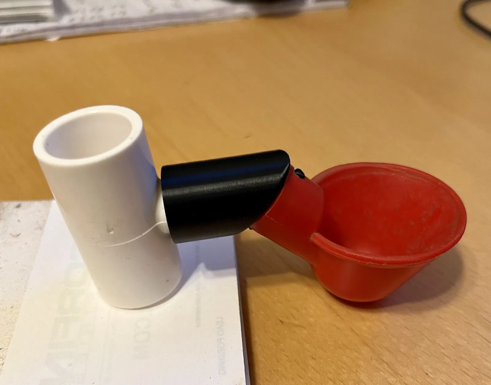 Tôi đã mua 6 cốc nước tự động cho gà từ Amazon. Chúng hoạt động rất tốt cho đến khi một con gà va chạm hoặc nhảy lên một trong số chúng. Điều này đã gây ra sự cố dễ dàng làm gãy chúng. Phiên bản gốc có một giá đỡ nhựa vặn ¼" không đủ mạnh để chịu được tác động từ những con gà. Thay vì gắn vào bên trong trục PVC có ren, những cái này được dán vào bên ngoài trục 0.56" (14.3mm) của phụ kiện PVC, làm cho chúng mạnh mẽ hơn đáng kể. Tôi đã làm của tôi bằng ASA. Việc dán yêu cầu một loại keo đặc biệt có sẵn tại bất kỳ cửa hàng phần cứng nào, tương thích cho cả PVC và ABS. Miễn là có một lối đi sạch cho nước chảy qua phụ kiện PVC, không cần phải loại bỏ phần bị gãy. Tôi đã sử dụng Oatley All Purpose Cement. Loại keo này có thể hoạt động với PLA và PETG (không chắc chắn) tuy nhiên tôi khuyên dùng ASA vì độ bền của nó. Giữ số lượng lớp tường và mật độ lấp đầy cao để có sức mạnh tối ưu. In cần một hỗ trợ nhỏ; tôi đã sử dụng hỗ trợ cây.