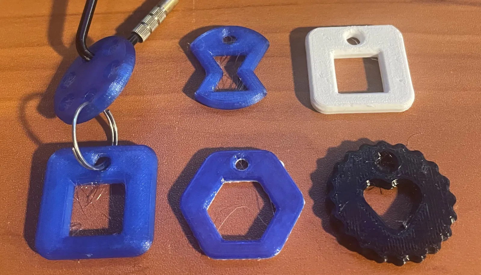 Đây là một mô hình nhỏ mà tôi sử dụng để làm móc khóa cảm ứng, cho những lúc ánh sáng kém hoặc khi bạn có nhiều chìa khóa trong túi, hoặc bất kỳ lý do nào khác. Mỗi mô hình khác nhau đủ để dễ dàng nhận biết bạn đang có cái nào, và bạn có thể nhận biết bằng cách nắm lấy các cạnh bên ngoài hoặc cảm nhận phần trung tâm. Mô hình hoàn toàn có thể thay đổi tham số, cho phép thay đổi kích thước và thông số theo ý muốn, và dự án bao gồm một mô hình nguyên thủy để làm cho việc tạo ra các thiết kế mới bằng các kích thước điều khiển trở nên dễ dàng.