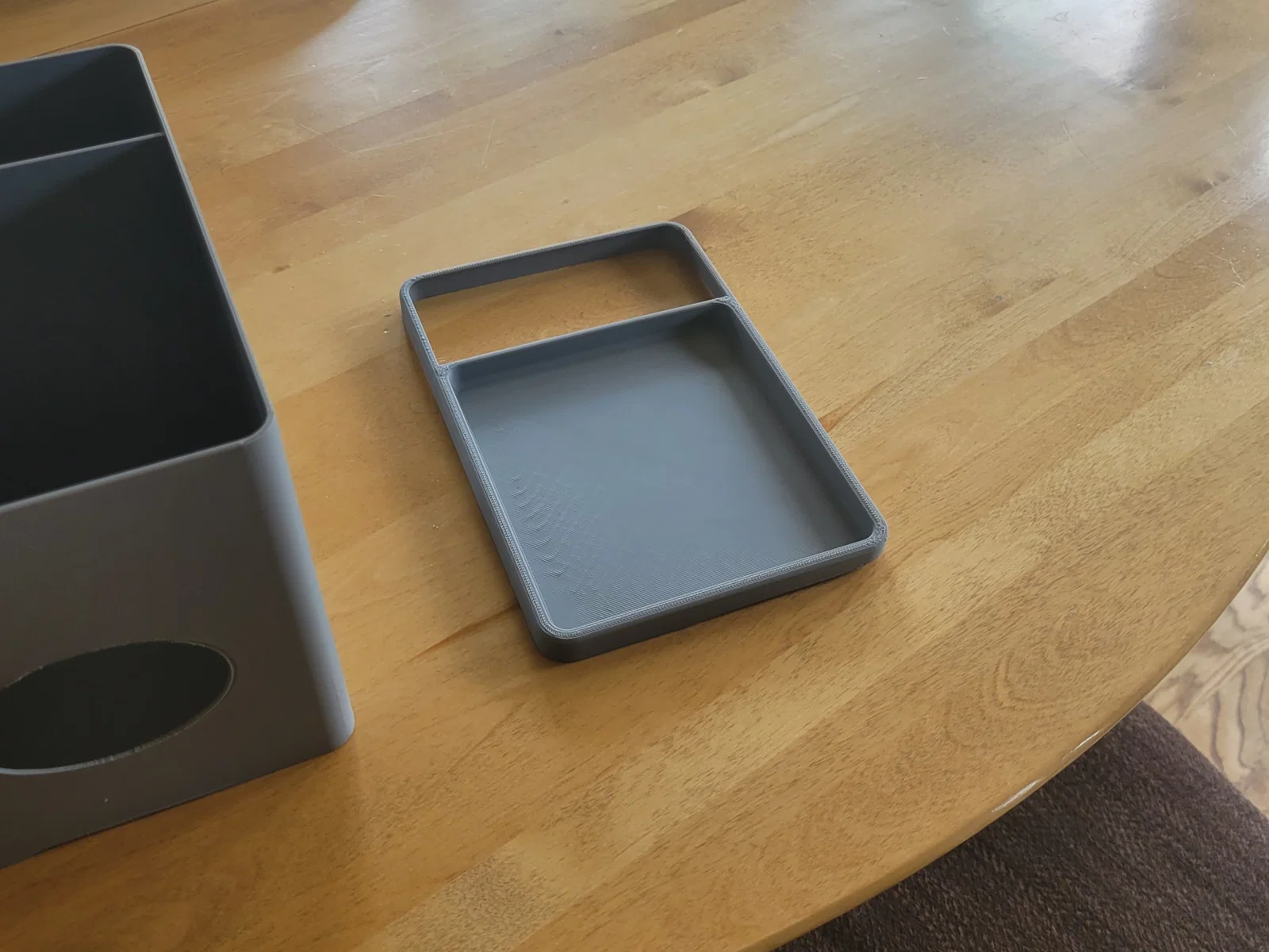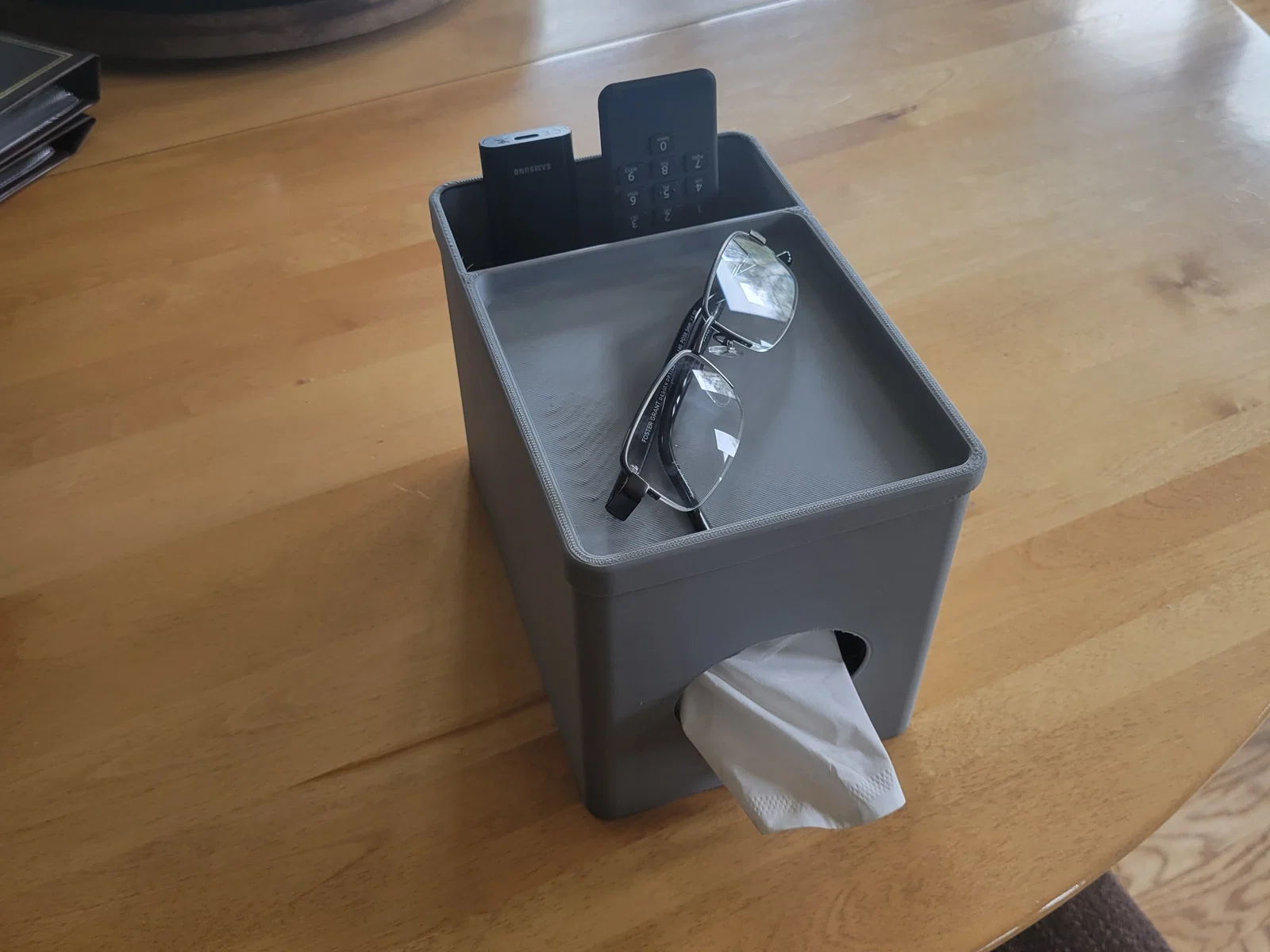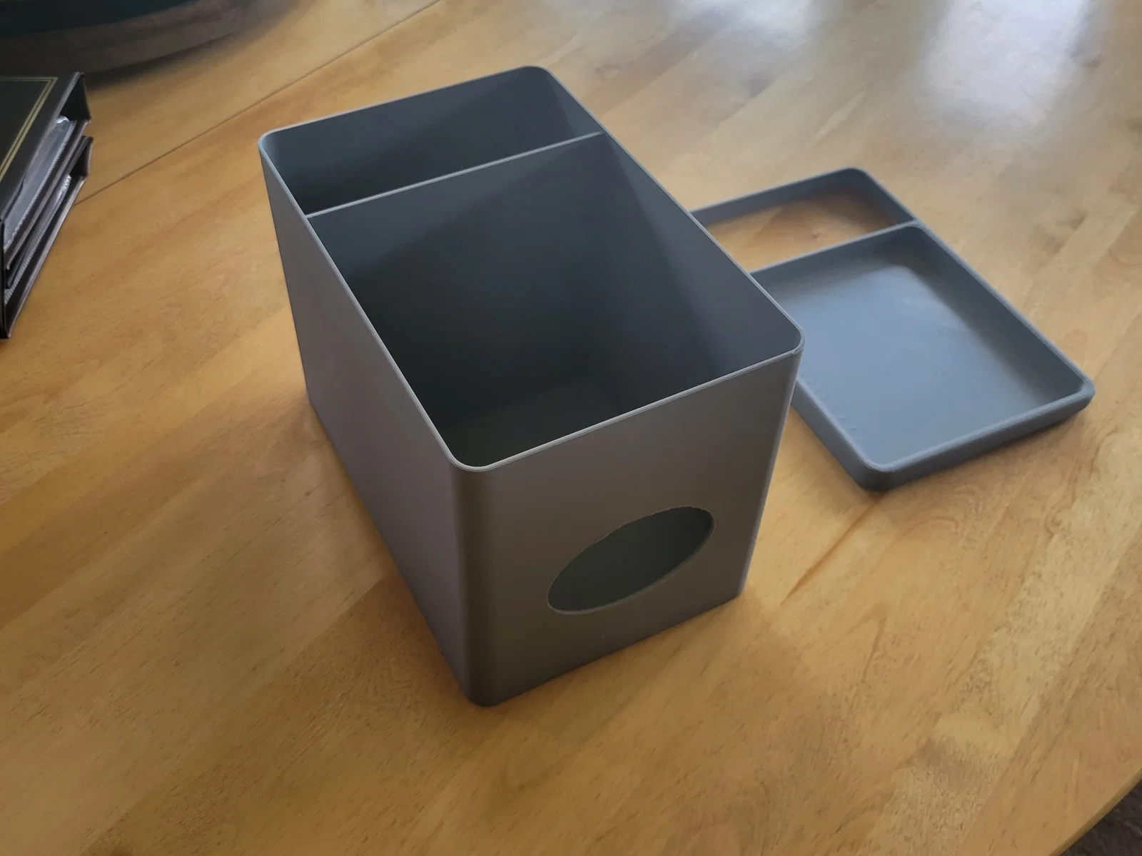 Tôi đã tạo ra vỏ hộp giấy này cho một hộp giấy nhỏ hơn. Nó có một ngăn sâu hơn để chứa điều khiển từ xa và một khay để chứa những đồ lặt vặt. Cái này khá nhẹ và tôi khuyên bạn nên thêm đệm cao su ở đáy để giữ nó không bị trượt.