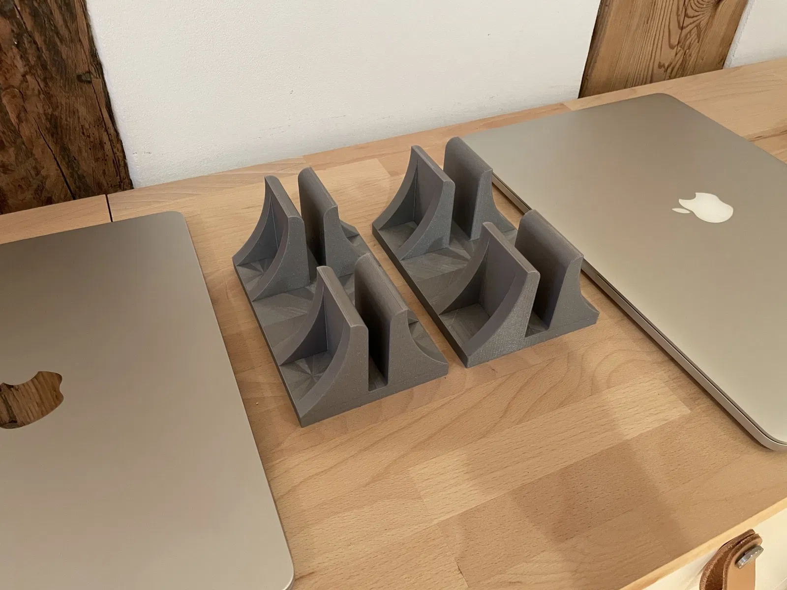 Các giá đỡ laptop đứng trong các bức ảnh được in mà không cần hỗ trợ, không có viền. Tôi đã sử dụng Prusa Mk3+ với PLA màu xám Galaxy.