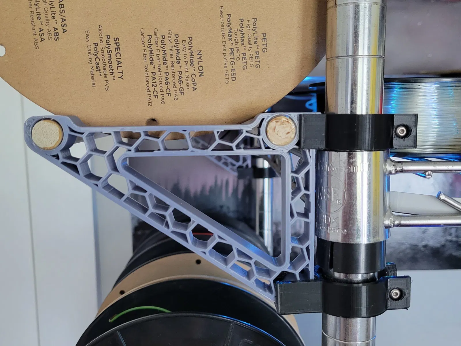 Giá đỡ filament tự lắp vào cột có đường kính 1". Các lỗ được thiết kế cho các thanh 0.5" theo lựa chọn của bạn. Nó được in thành các phần và cần được dán lại với nhau. Giá đỡ cột sử dụng ốc vít và đai ốc M3. Tôi đã in giá đỡ cột bằng PETG (đen) và giá đỡ kệ bằng ABS (xám) và tôi không gặp vấn đề gì khi tải các kệ. Để có được mẫu hình lục giác, tôi đã sử dụng infill lục giác ở mức 10% với 0 lớp trên và dưới.