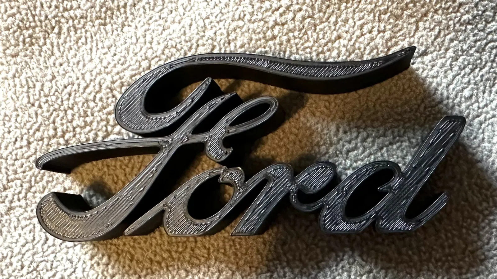 Đây là một bản in đơn giản của chữ ký logo Ford mà không có hình oval xung quanh. 3 tab được bao gồm để kết nối các phần khác nhau của chữ "F" với phần còn lại của bản in, và đáy của logo phẳng, vì vậy nó có thể đặt trên bất kỳ bề mặt nào.