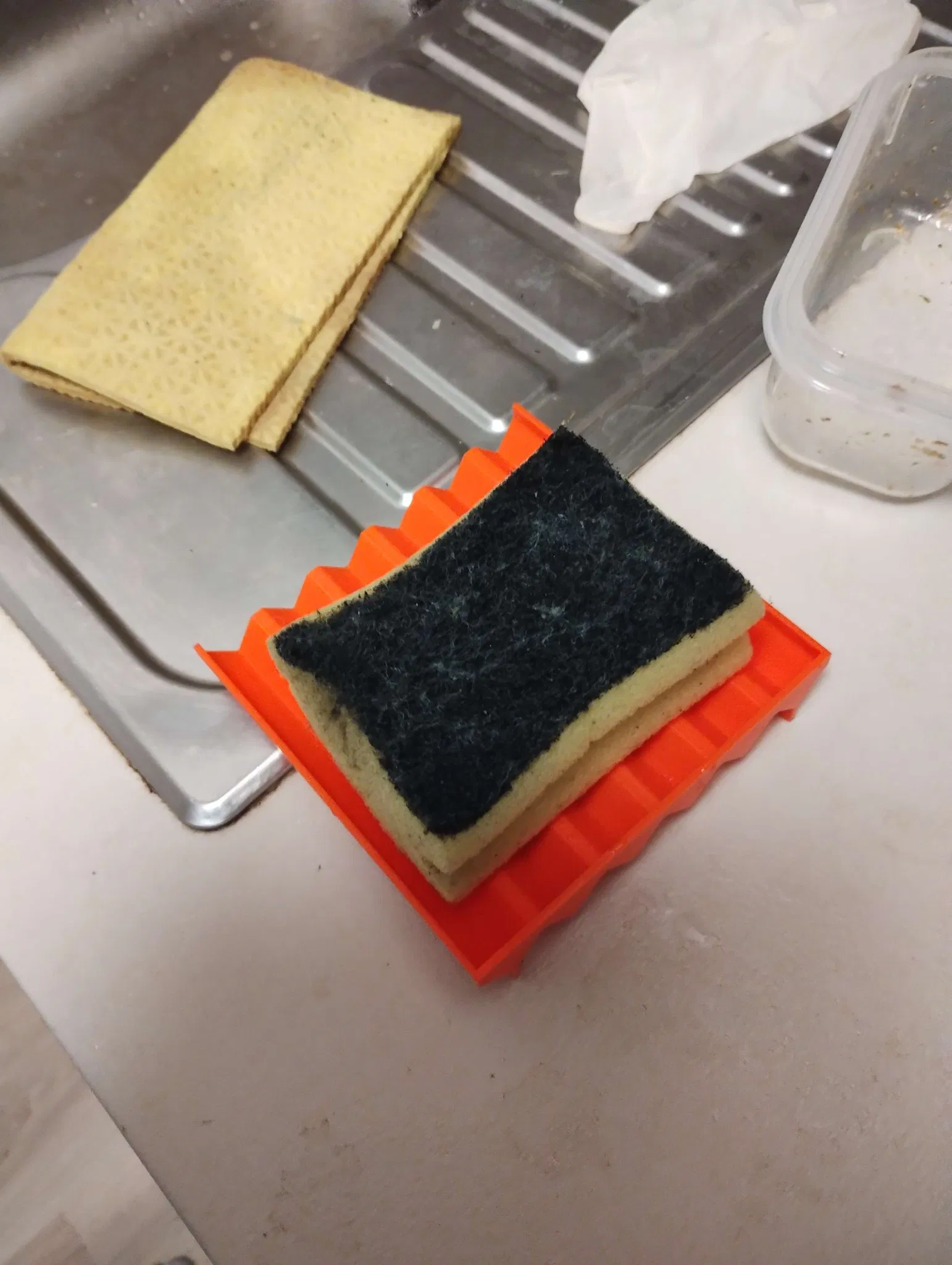 Khay bọt biển với các kênh thoát nước. In nhanh & rẻ. Có chân ở một bên - khay được thiết kế để nghiêng để khi bạn đặt nó cạnh bồn rửa, nước sẽ nhỏ giọt vào bồn rửa.