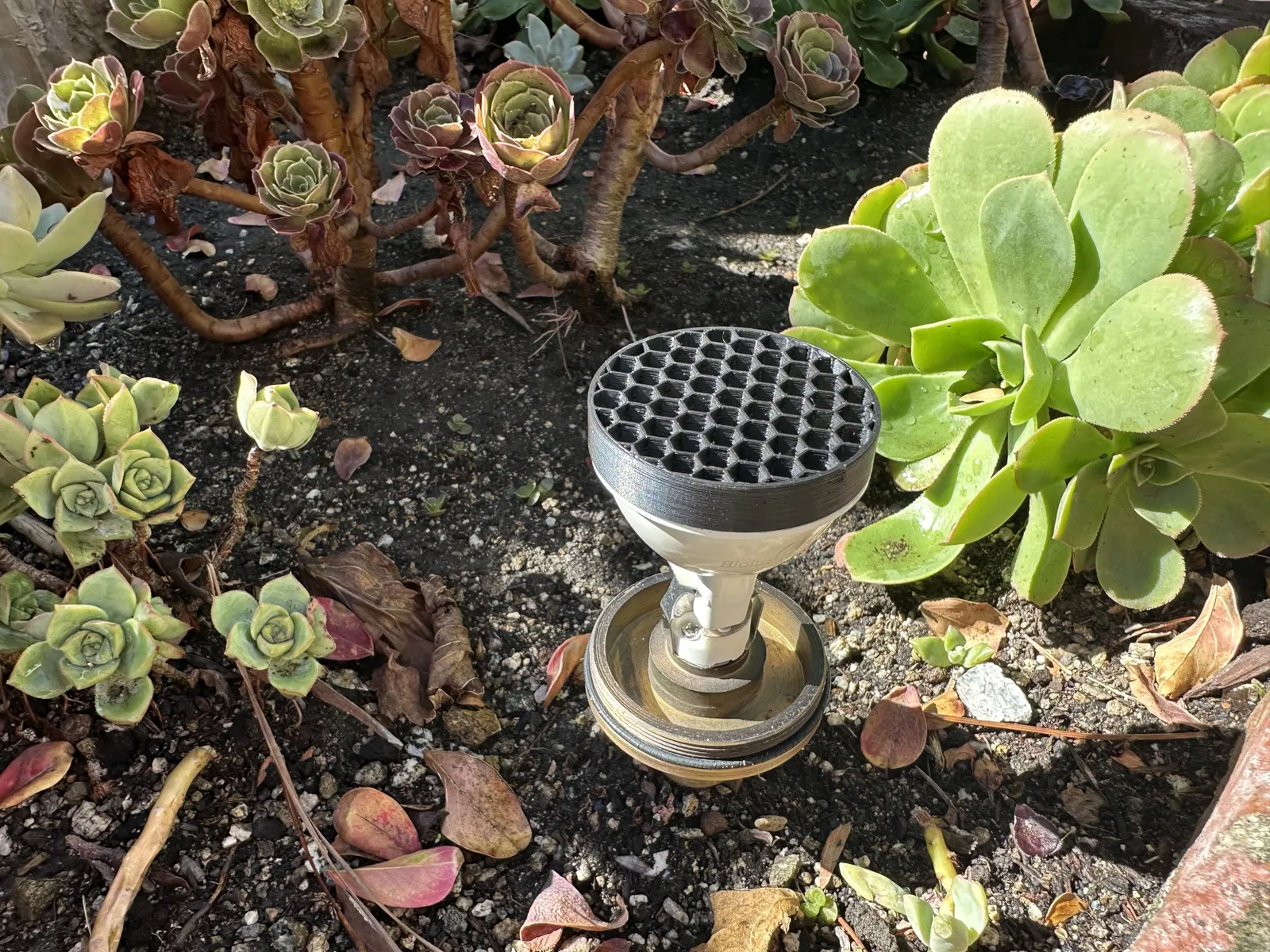 Tấm wafer tổ ong dày 4mm với một chân đế 5mm, để giữ cho tổ ong cách xa bề mặt bóng đèn. Nếu không có chân đế, tổ ong sẽ bị biến dạng và chảy ra khi in ASA/ABS (tin tôi đi, tôi biết). Chiều cao tổng cộng là 9mm mà nhiều đèn chiếu sáng cảnh quan nên có thể chứa được. Trong trường hợp của tôi, sự kết hợp giữa MR16 và đèn chiếu sáng có thể chứa tối đa 14mm chiều cao tổng cộng. Các bản in trong hình là Prusament ASA - Jet Black.