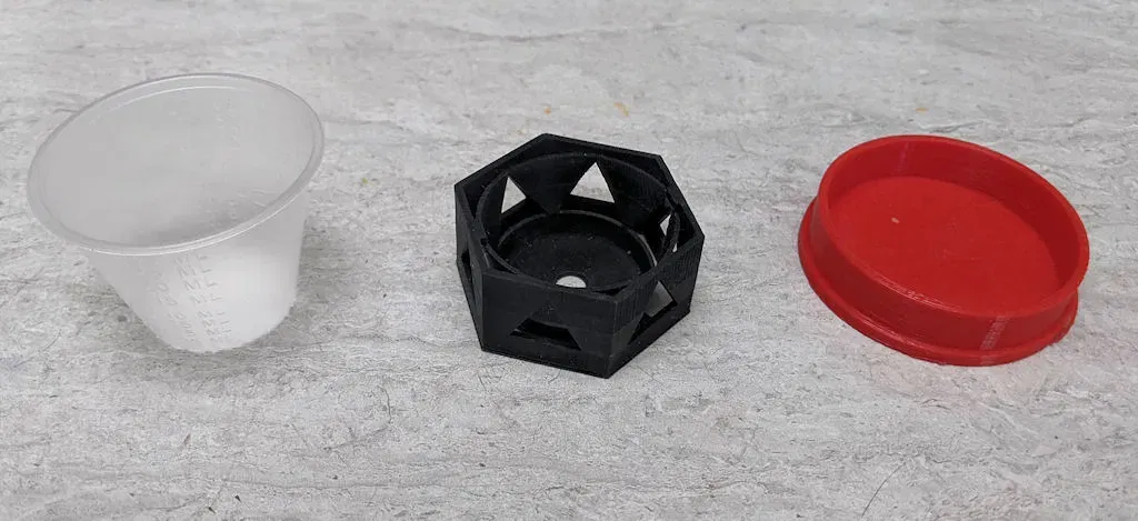 Những giá đỡ cốc và nắp này được thiết kế để sử dụng với cốc thuốc 1 ounce dùng cho sơn. Các giá đỡ cốc và nắp in tốt cả trong nhựa resin và PLA. Nắp có hơi nặng cho nhựa resin, nhưng chúng in rất chắc chắn trong PLA. Nắp tạo ra một fit chặt chẽ trên cốc, nhưng không kín khí. Vì vậy, thật tuyệt nếu bạn đã trộn màu đặc biệt và muốn làm việc với nó trong vài ngày. Những cái này không dành cho lưu trữ lâu dài. Các cốc tự thân khá bền, tôi đã sử dụng chúng với sơn acrylic, IPA và acetone mà không gặp vấn đề gì.