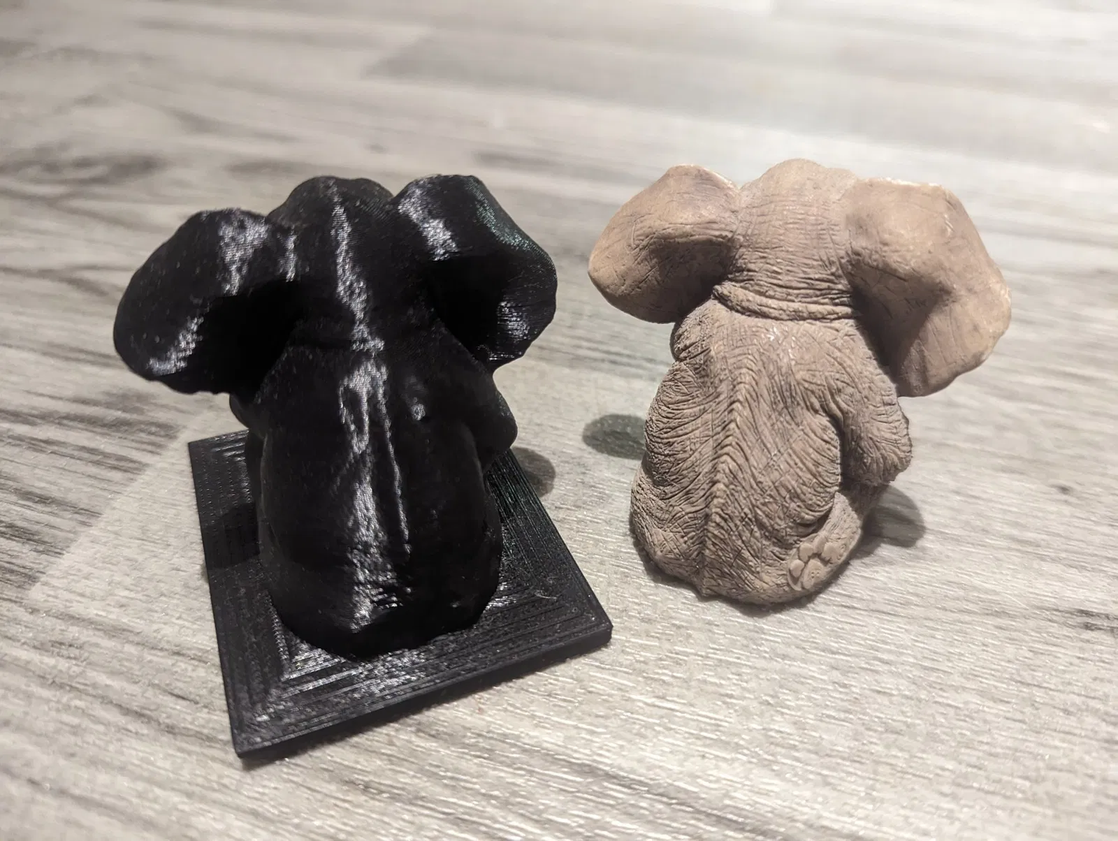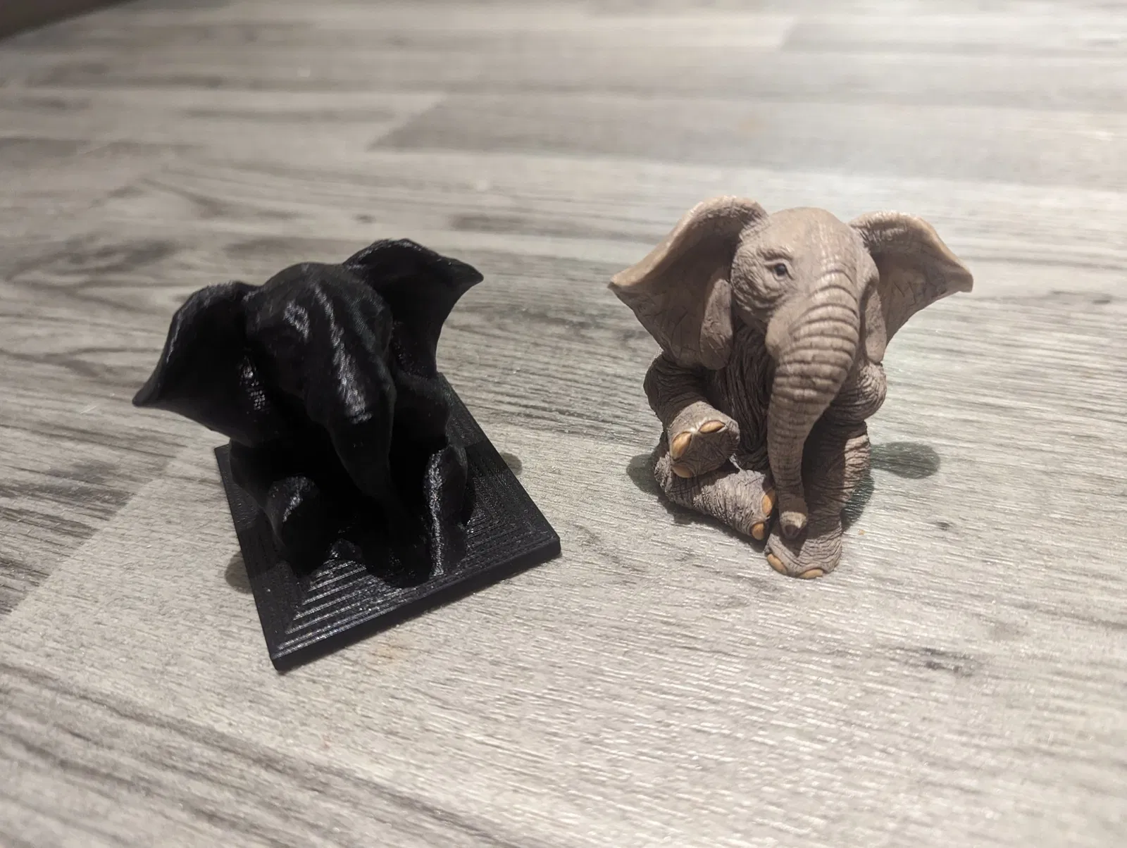 Chỉ một chú voi nhỏ ngồi xuống, được sản xuất theo tỷ lệ từ một đồ trang trí như một bài kiểm tra để tạo ra một đối tượng từ một bản quét 3D.
