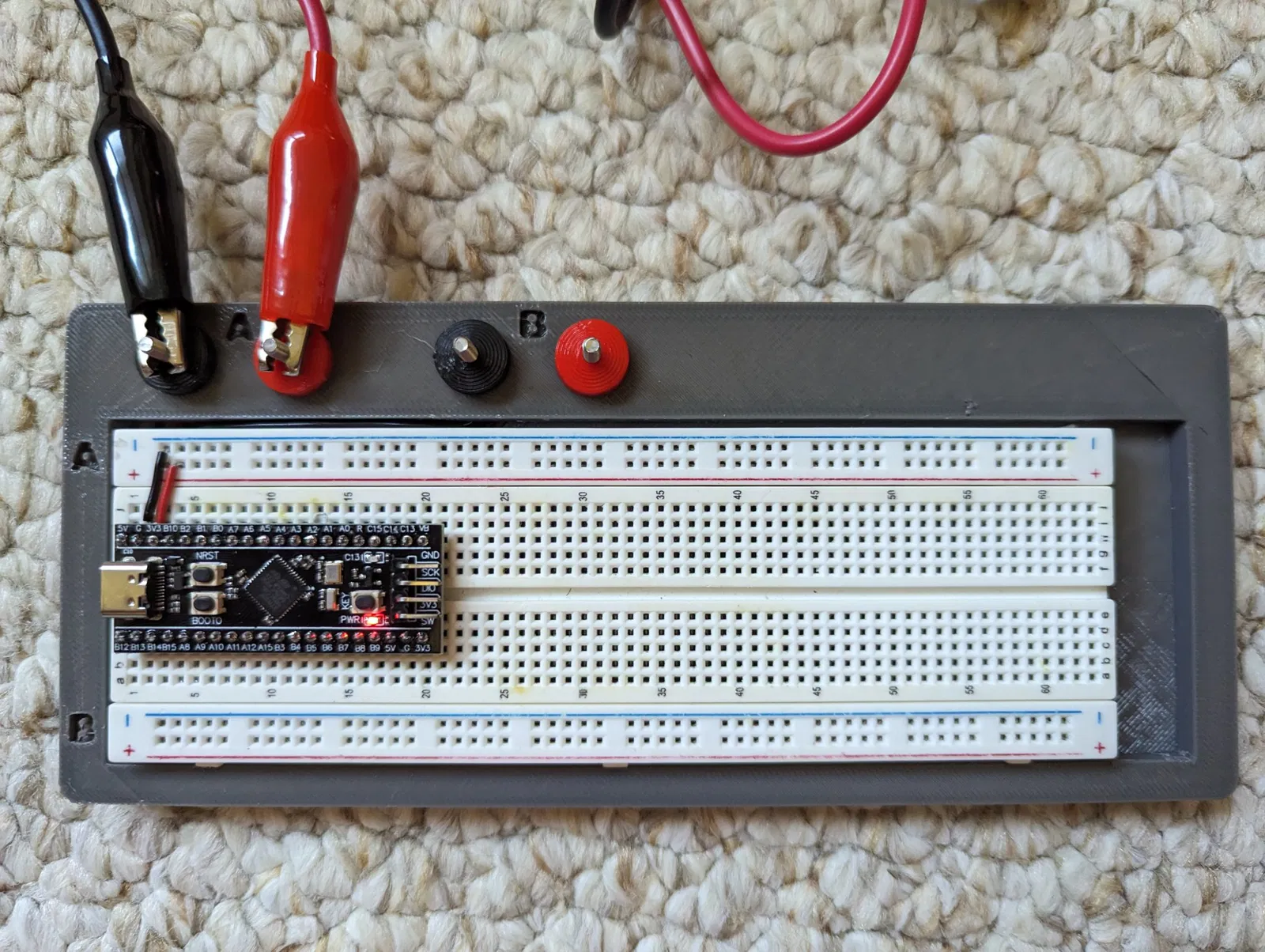 Giá đỡ breadboard này có nguồn điện cho cả hai đường ray, có thể được cấp điện với các điện áp khác nhau nếu cần. Chúng chia sẻ một mặt đất để ổn định.