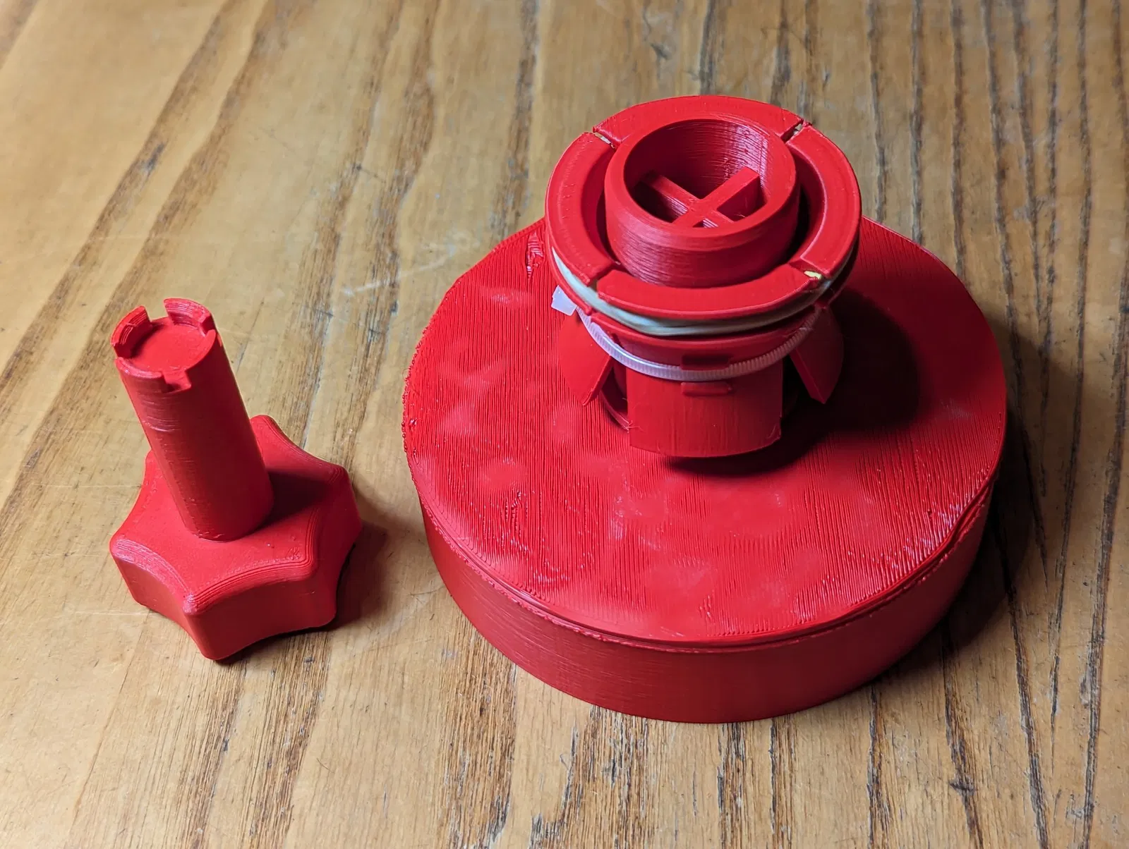 Việc lắp ráp yêu cầu một dây buộc để giữ các phần chốt vào các trục của chúng (đừng siết quá chặt) và một dây cao su hoặc vòng bungee để giữ chốt đóng lại. Bạn cũng cần 4 vít tự khoan ngắn để giữ ống dẫn vào bộ chuyển đổi.