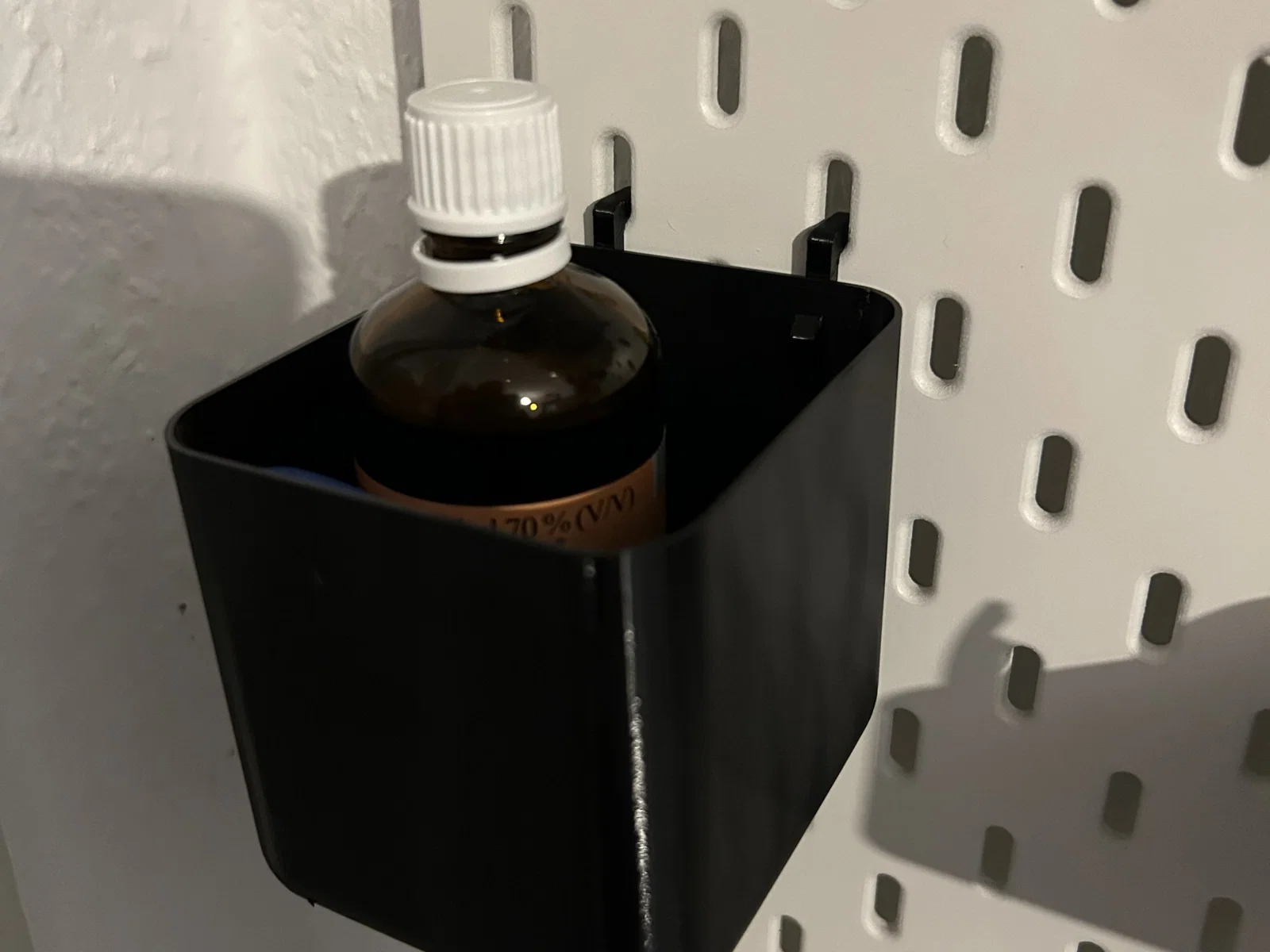 Tôi đã lấy cốc Skadis bình thường từ bản gốc và tháo các móc trên đó. Thay vào đó, tôi đã khoan 2 lỗ vào nó, trong đó một số móc sau đây có thể được chèn vào: