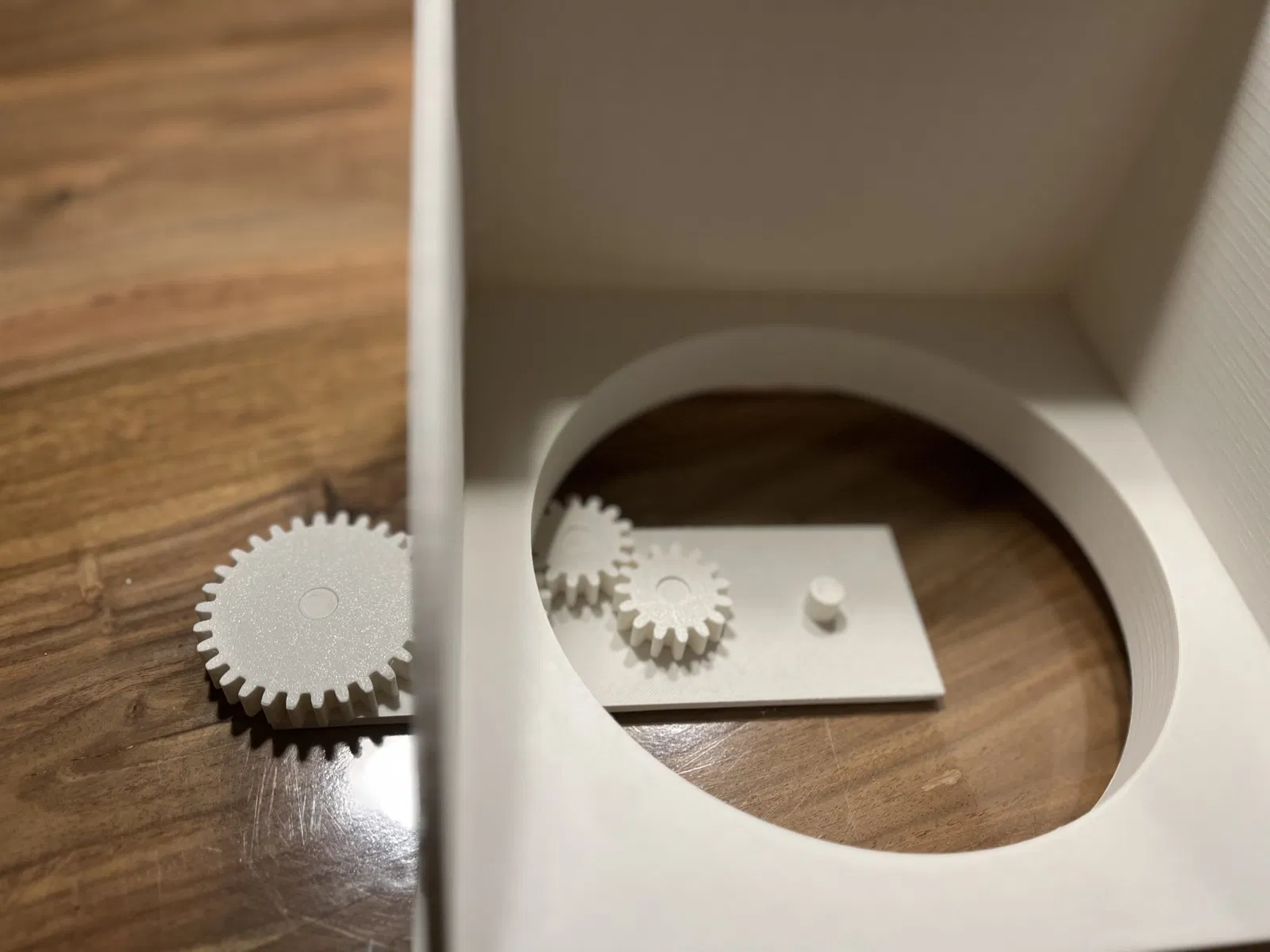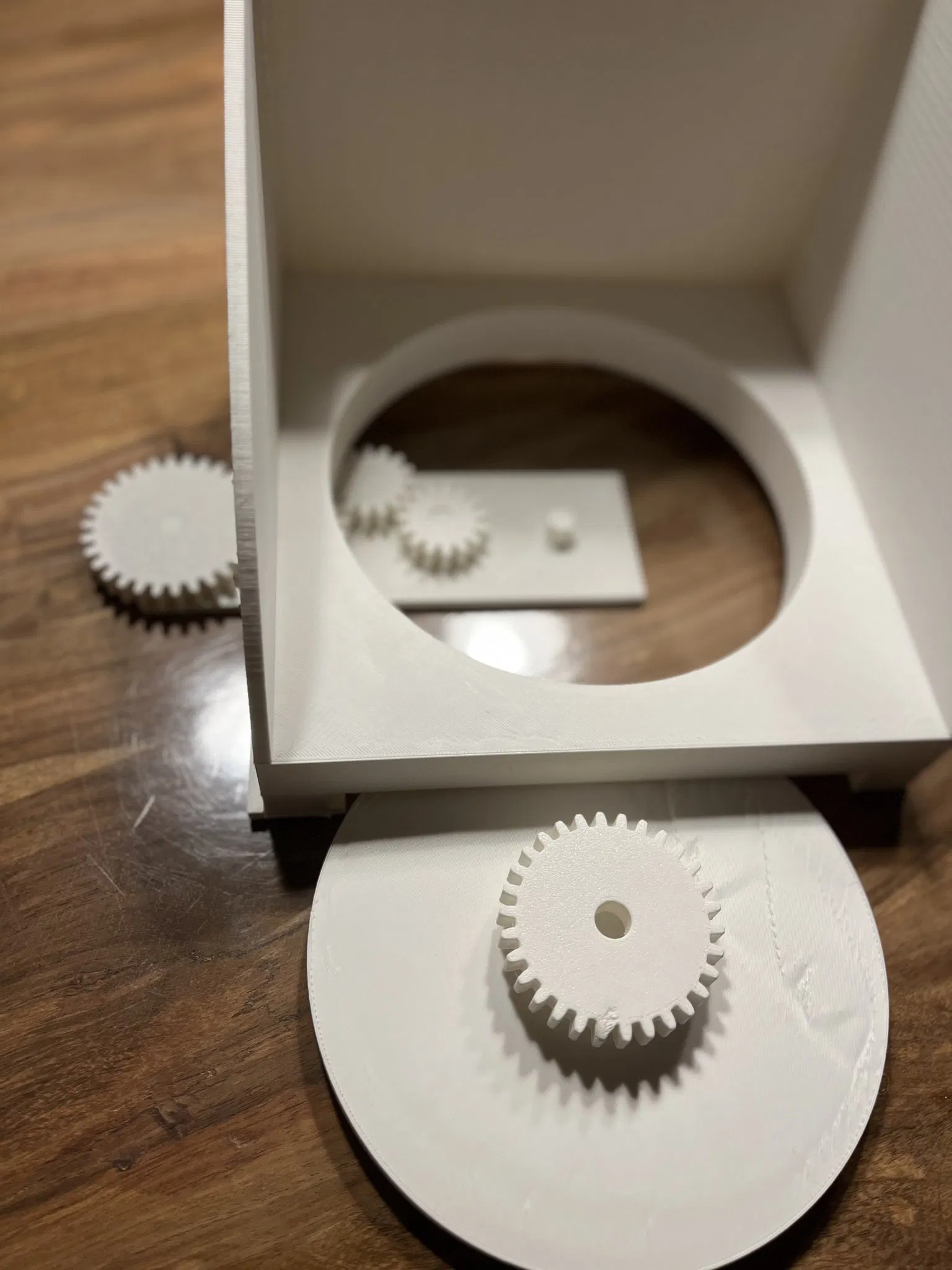 Thư mục Gear: Chứa các thành phần của thiết bị và bản nền để lắp ráp. - SprayBox-Gearboard.3mf: Bản nền với các phụ kiện giữ thiết bị được gắn bên dưới SprayBox. - SprayBox-GearManual.3mf: "Thiết bị chính" có thể được xoay bằng tay để di chuyển bản xoay. - SprayBox-GearManualStick.3mf: Một tay cầm tùy chọn có thể được gắn vào thiết bị chính để dễ dàng xoay hơn. Nếu không sử dụng, nên lắp đặt nó ngược lại để có vẻ ngoài thẩm mỹ hơn. - SprayBox-GearRotatingDisk.3mf: Thiết bị mà trên đó bản xoay được gắn. - SprayBox-GearSmall(3x).3mf: Ba thiết bị nhỏ hơn đảm bảo kết nối giữa thiết bị chính và thiết bị với bản xoay.