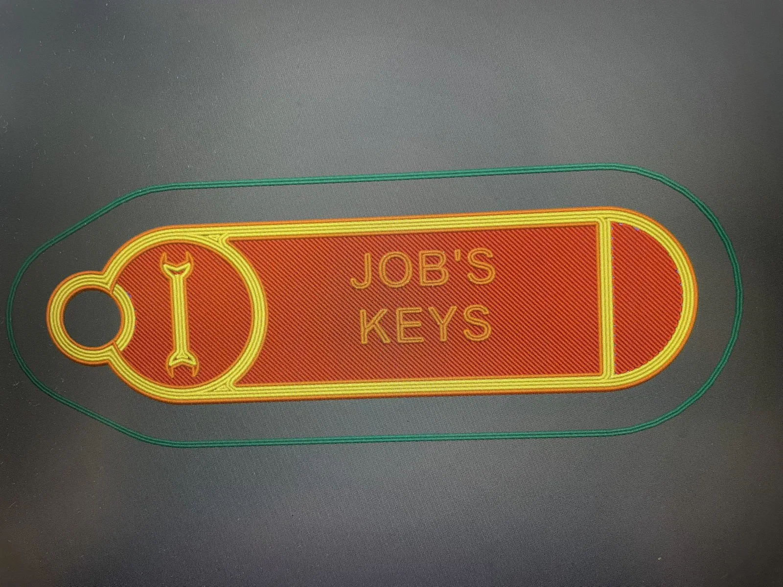 Klíčenka už prošla tiskem, ale s jiným textem. Tištěno tryskou 0,2mm šířka vrstvy 0,1 a zapnuta funkce ironing. Vypada to moc pekne. Tisk na enderu 3V2 cca 25min.