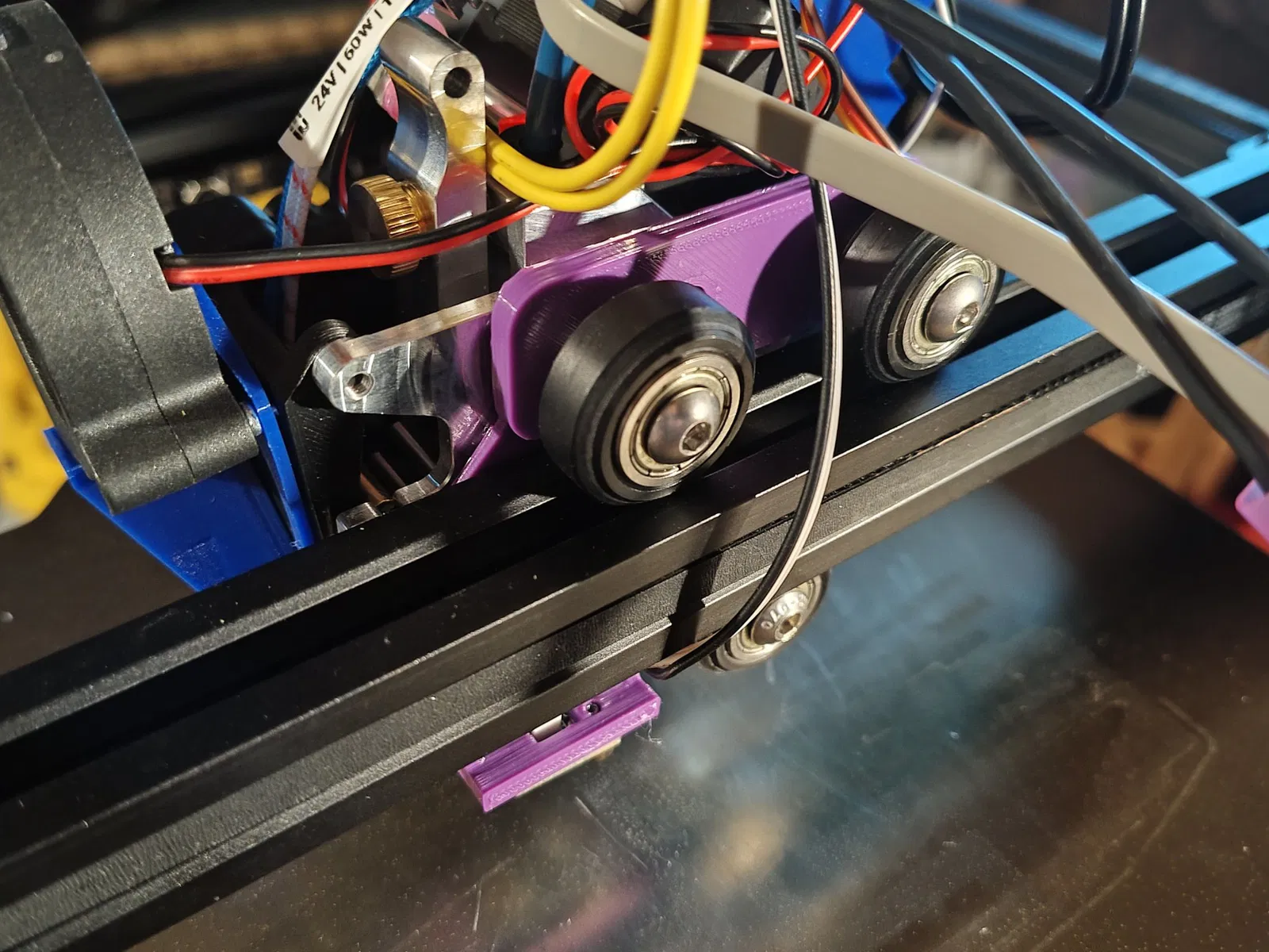 Nới lỏng đai ốc lệch ở dưới đáy đầu công cụ và sau đó tháo hai bánh xe lăn ở trên cùng ra khỏi đầu công cụ. Nhẹ nhàng kéo đầu công cụ ra khỏi phần đùn 2020 để bạn có thể trượt phần trên của giá đỡ lên và sau đó xoay nó sao cho hai lỗ lớn căn chỉnh với các chân đỡ bánh xe ở phía trên của đầu in. Đẩy giá đỡ qua các chân đỡ đó và chèn một ốc M3x4mm vào lỗ nhỏ, và siết chặt lại. Điều này sẽ giúp giá đỡ được gắn chắc chắn vào đầu công cụ.