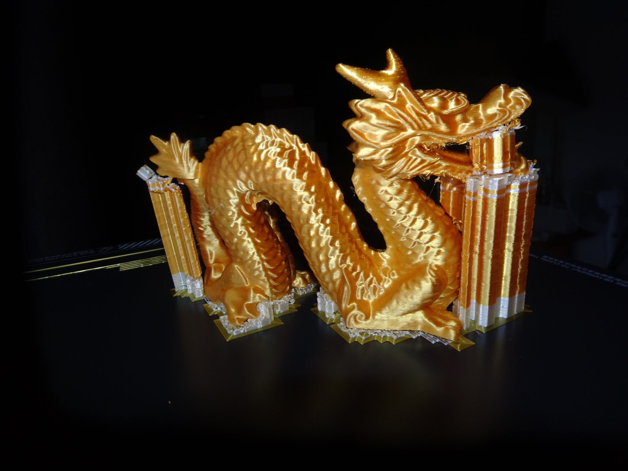 Đây là một bức tượng Rồng Trung Quốc, mà tôi đã tải xuống từ Kho lưu trữ Quét 3D Stanford. Rồng Trung Quốc này truyền thống mang lại may mắn cho những ai đặt nó đúng cách trong nhà của họ. Rồng không thích bị in, nó sẽ cuộn lên cuộn xuống và cố gắng không bị in. Nhưng nếu bạn không bỏ cuộc, cuối cùng nó sẽ ngồi dũng cảm trên bậc thềm nhà bạn và chờ đợi may mắn vào nhà bạn. Tôi đã thêm các tệp như tôi đã in nó trên máy in Bambu Lab X1 của mình. Đối với các giá đỡ, tôi đã sử dụng sợi "Bambu Support W" trong AMS-Slot 4, xem hình ảnh. Đối với sợi vàng trong AMS-Slot 1, bạn có thể sử dụng Gold PLA Filament vì Support W chỉ hoạt động cùng với các sợi PLA khác. Gợi ý: Muốn nó LỚN? Tôi đã tải lên một phiên bản lớn hơn ở đây: