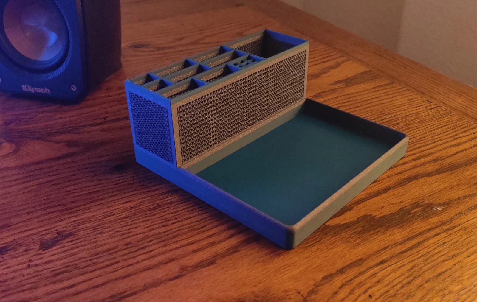 Đây là một công cụ tổ chức "Đặt ở bất kỳ đâu" di động. Nó có thể được sử dụng để tổ chức các công cụ cho bất kỳ dự án nào mà bạn đang làm, cho MakerSpace của bạn ở bất cứ đâu bạn làm việc. Nhiều không gian lưu trữ và một khay rộng rãi cho tất cả các công cụ của bạn. Tôi đã làm điều này theo yêu cầu của mẹ tôi để tổ chức các công cụ của bà cho "Máy đan tất 3D" của bà. < Tôi đã làm điều này từ Hộp công cụ V3 của tôi cho Prusa MK3S. 2 lần thay filament! Đảm bảo rằng giường của bạn sạch sẽ và lớp đầu tiên VỮNG chắc và sẵn sàng để đi! Hai lần thay filament và các bộ điều chỉnh độ đầy tạo cho nó vẻ ngoài đa dạng. Tôi sẽ bao gồm blender, GCode, slicer và STL. Bạn có thể chỉnh sửa và remix nó theo cách bạn thích. Tôi đang bao gồm một cái không có thương hiệu, và một cái có thương hiệu Prusa. Tôi gợi ý đặt chân cao su cho nó. https://www.amazon.com/gp/product/B07CNQC695/ref=ppx_yo_dt_b_search_asin_title?ie=UTF8&psc=1 Cảm ơn bạn rất nhiều vì đã xem công việc của tôi!