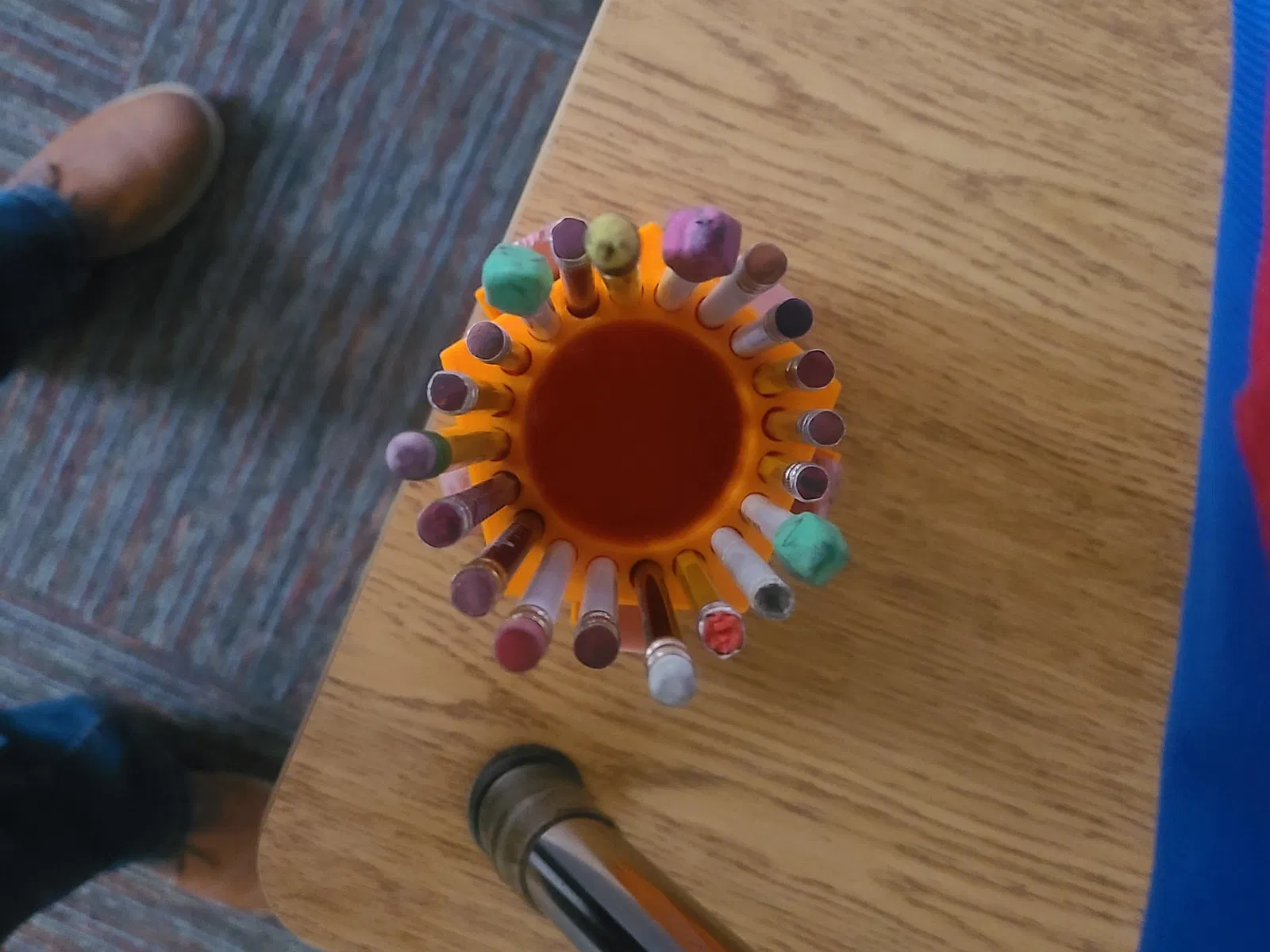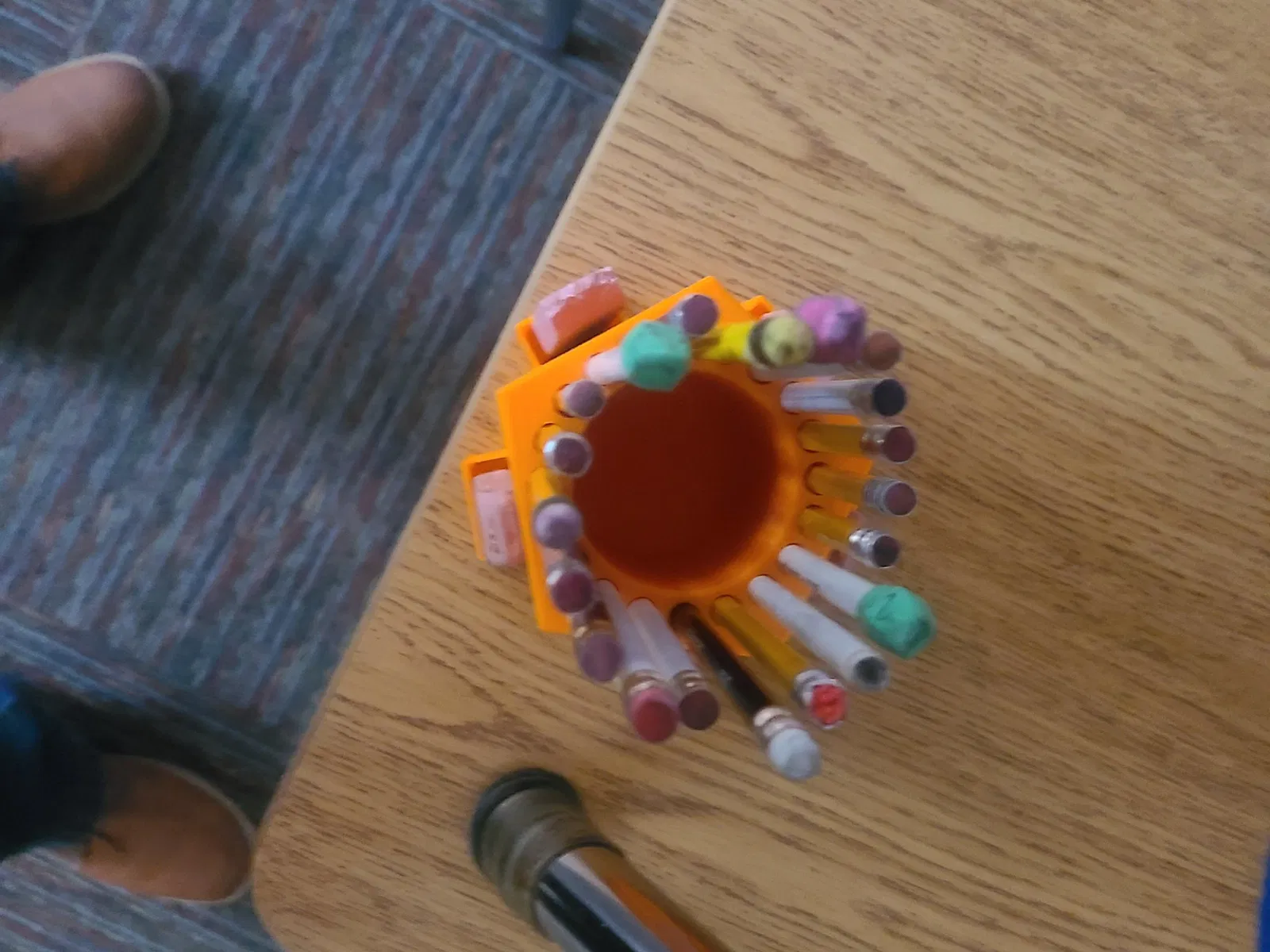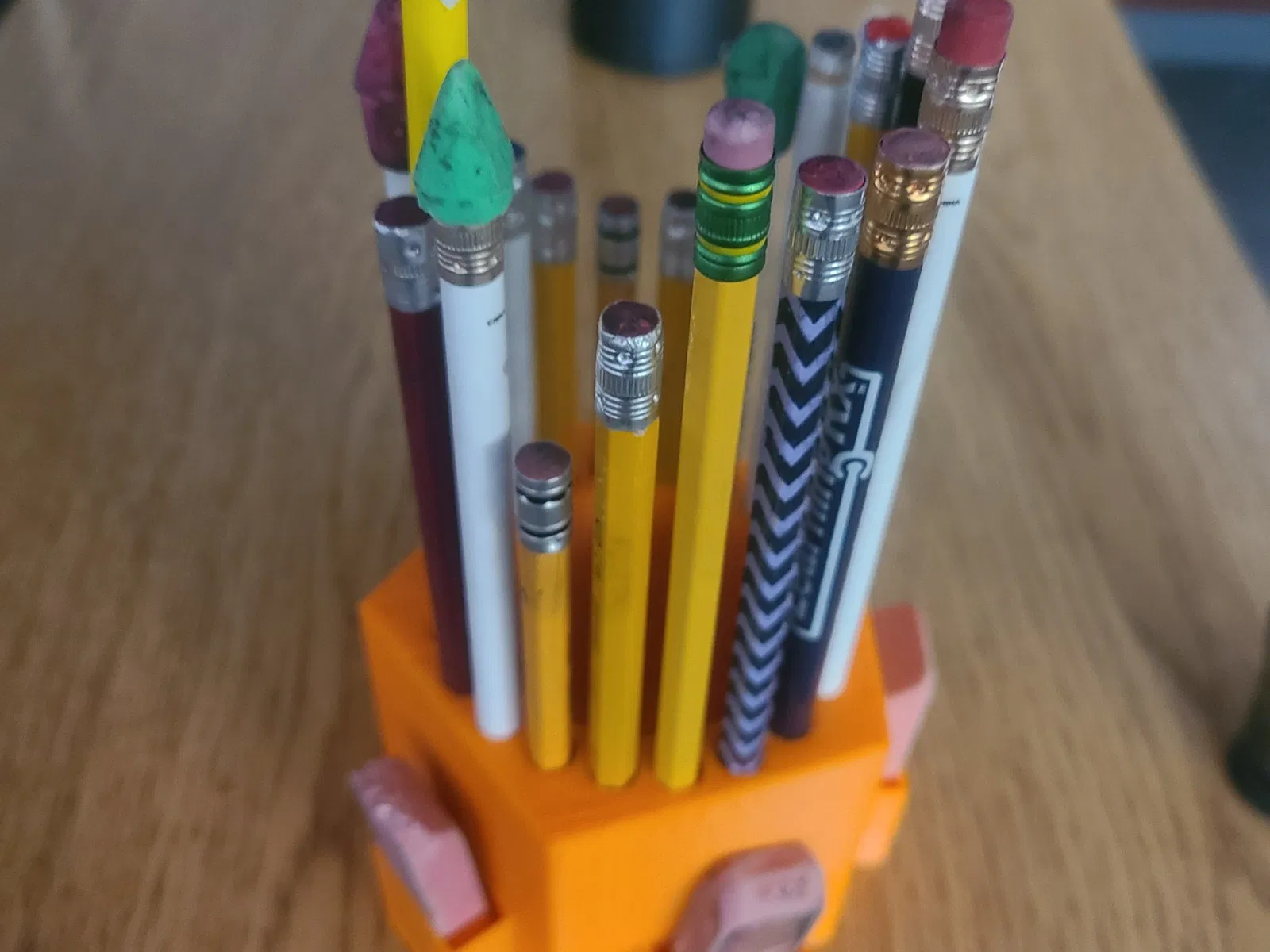 Đây là một giá đỡ bút chì cũng có năm ngăn cho cục tẩy màu hồng ở bên ngoài. Có các lỗ xung quanh viền nơi bạn có thể đặt bút chì đã được gọt nhọn xuống dưới và chúng sẽ không bị gãy hoặc cùn. Học sinh có thể nhanh chóng xác định bút chì nào là sắc và bút chì nào là cùn.