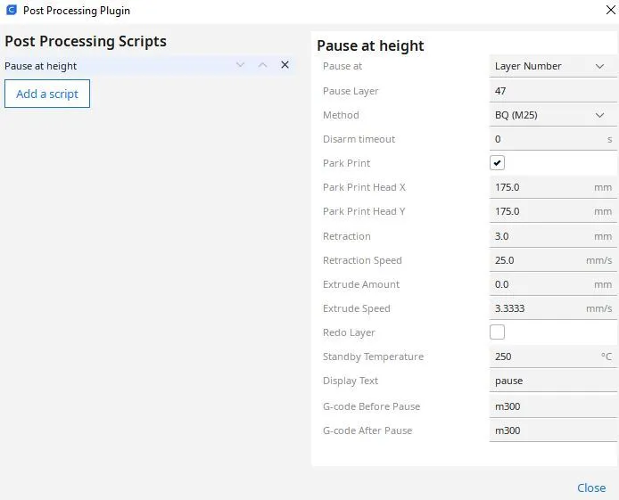 eSlicer có một tính năng tốt cho phép bạn tạm dừng ở một chiều cao hoặc lớp nhất định. Đi tới Extensions->Post Processing->Modify G-Code sau đó chọn Pause at Height. Tôi đã tải lên một hình ảnh để giúp bạn tìm nó.