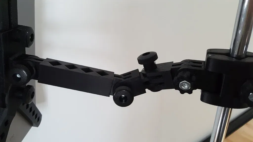 Bản lề nối Thân chính của kẹp và Bên bản lề của kẹp là một đoạn ngắn của dây treo áo, và kẹp xoay trong một đai ốc barrel, mà tôi đã in tại chỗ bằng cách sử dụng lệnh tạm dừng.