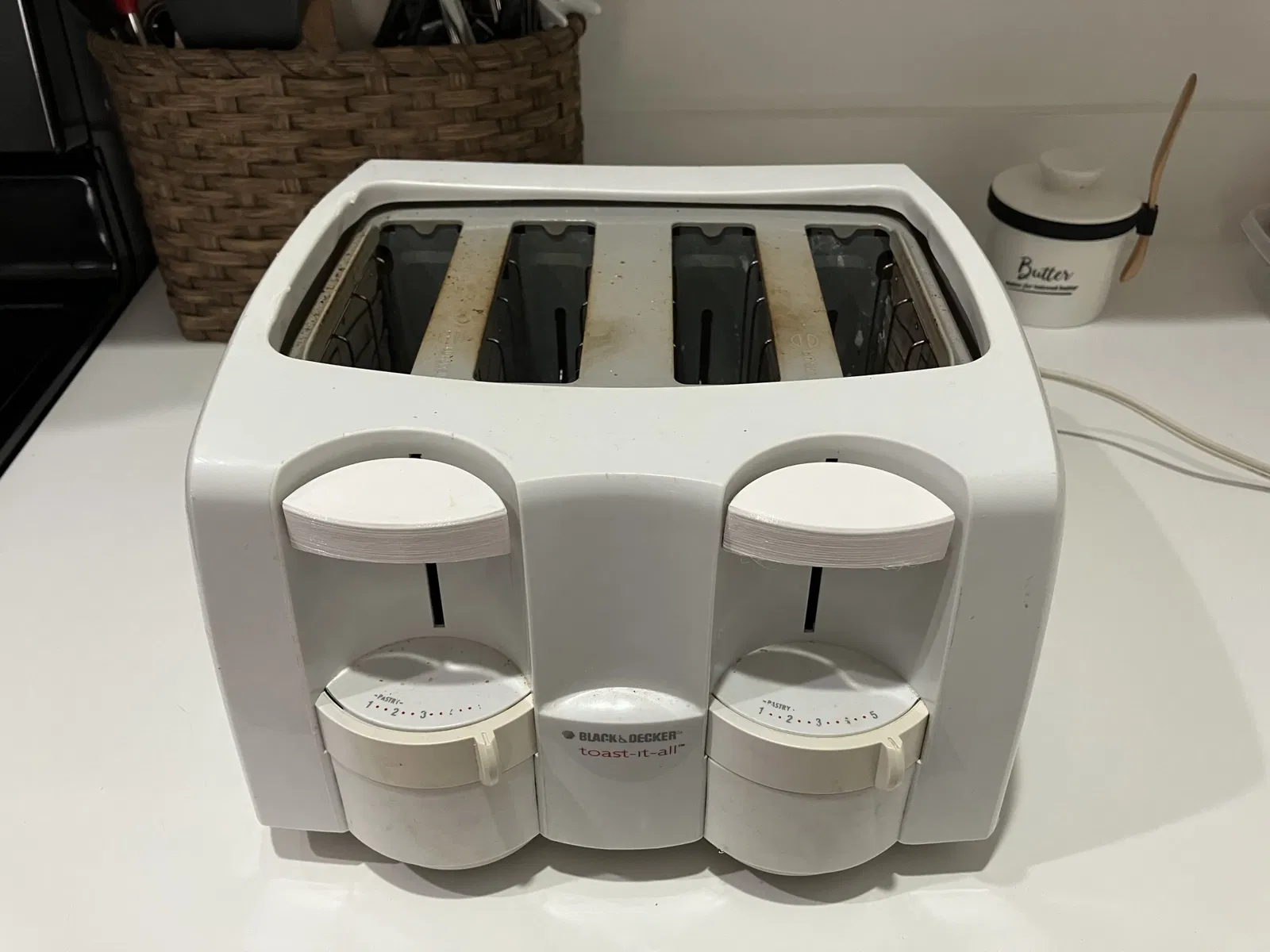 Các tay cầm presser gốc chỉ kéo dài được vài năm sau khi chúng tôi mua chiếc máy nướng bánh Black and Decker Toast-It-All. Trong nhiều năm sau đó, chúng tôi đã sử dụng nút chai rượu làm tay cầm. Tôi biết - tại sao phải bận tâm sửa một chiếc máy nướng bánh giá 50 đô la? Một lý do là - nó vẫn hoạt động tốt, và lý do thứ hai - có quá nhiều nhựa trong thân máy nướng bánh, thật đáng tiếc nếu phải vứt nó vào bãi rác.
