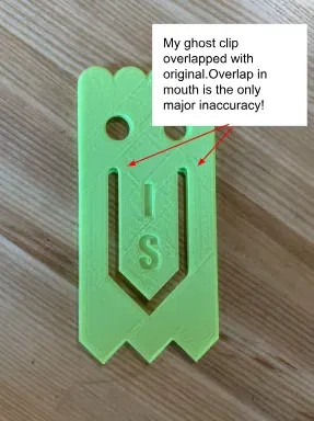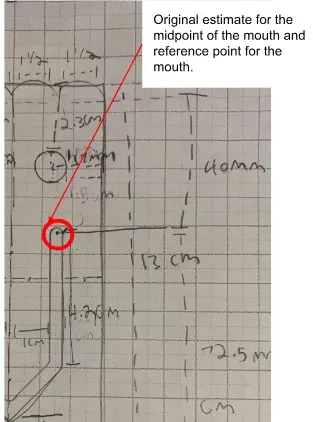 Thay đổi của chúng tôi là điểm nào để tham chiếu cho đường thẳng của chúng tôi. Chúng tôi đã thay đổi điểm tham chiếu của mình từ điểm trung tâm của cung hình vòm bao trùm miệng đến điểm bắt đầu của đường thẳng mà chúng tôi đã dịch chuyển để hình thành miệng. Chúng tôi ban đầu dự định tạo ra đường giữa của miệng và dịch chuyển hai đường ở mỗi bên để hình thành miệng cuối cùng, nhưng cách mà chúng tôi xác định điểm bắt đầu cho đường giữa chỉ đơn giản là ước lượng giữa và đo lường mối quan hệ của điểm tưởng tượng đó với các phần khác của chiếc kẹp giấy ma. Với một số phản hồi từ giáo viên, chúng tôi nhận ra rằng không có cách hợp lệ nào để chúng tôi biết chắc chắn rằng điểm tưởng tượng mà chúng tôi đang hình dung cách cạnh 13 cm, như chúng tôi đã đo. Điều này có nghĩa là dự án của chúng tôi có nguy cơ sai sót trước khi chúng tôi thậm chí bắt đầu. Vì vậy, thay vào đó, chúng tôi đã thay đổi điểm tham chiếu thành cạnh của miệng. Đây là một điểm mà chúng tôi thực sự có thể đo lường chắc chắn và loại bỏ phần sai sót mà chúng tôi lo sợ.