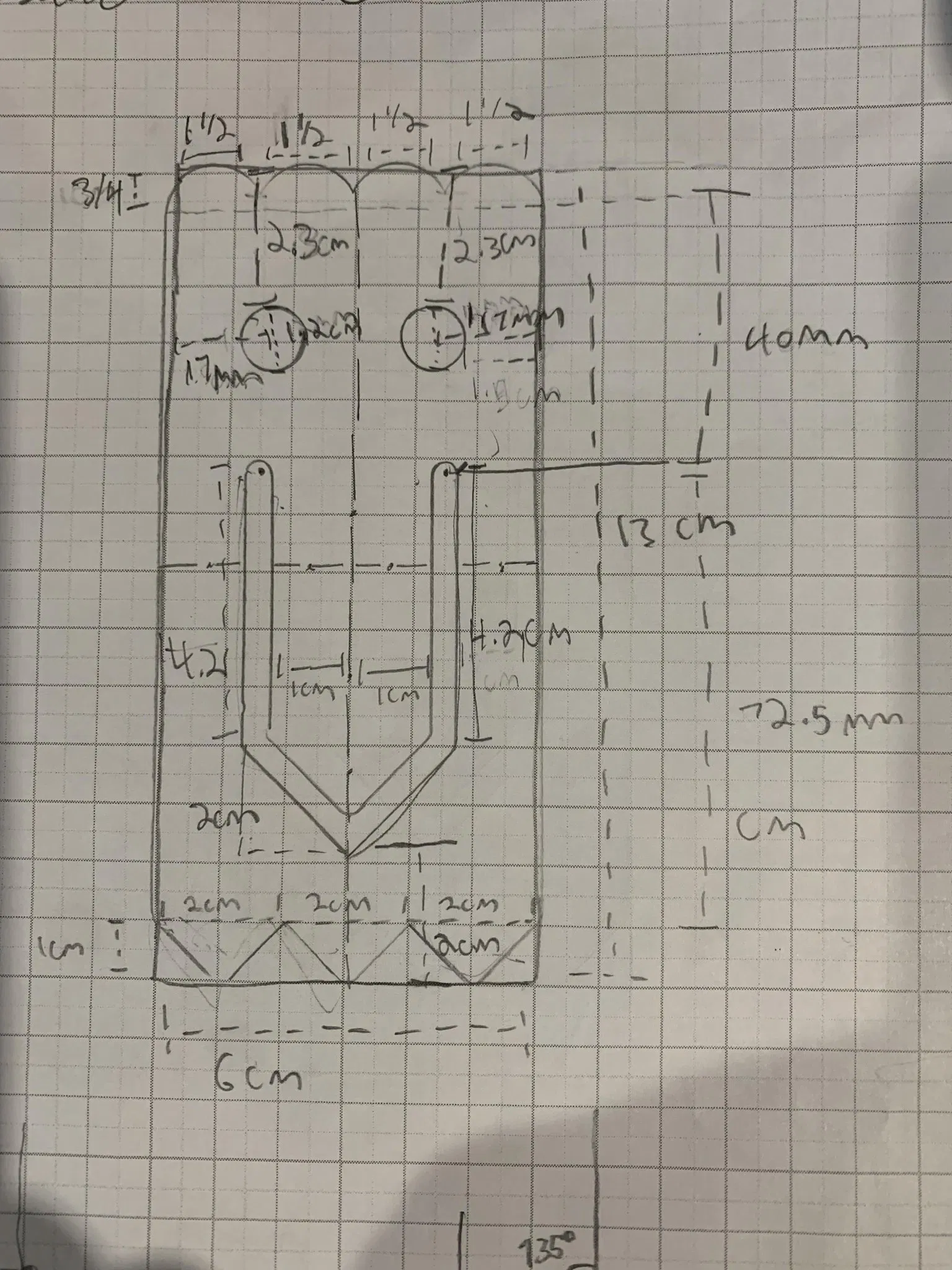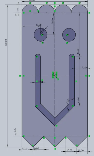 14. Tạo một điểm cách đỉnh 40mm và cách bên 12mm, tạo một đường xây dựng kéo xuống 45mm từ điểm đó, sau đó một đường xây dựng khác kéo xuống ở góc 135° cho đến khi nó kết nối với đường giữa.