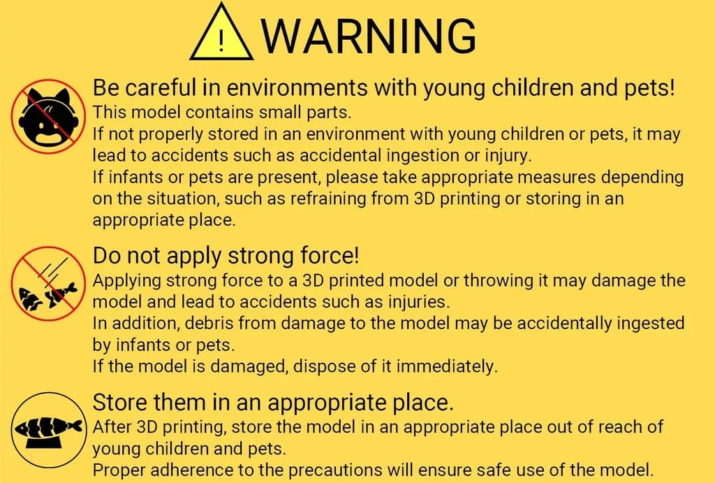 Nếu có trẻ sơ sinh hoặc thú cưng, vui lòng thực hiện các biện pháp phù hợp tùy theo tình huống, chẳng hạn như kiêng không in 3D hoặc lưu trữ ở nơi thích hợp.