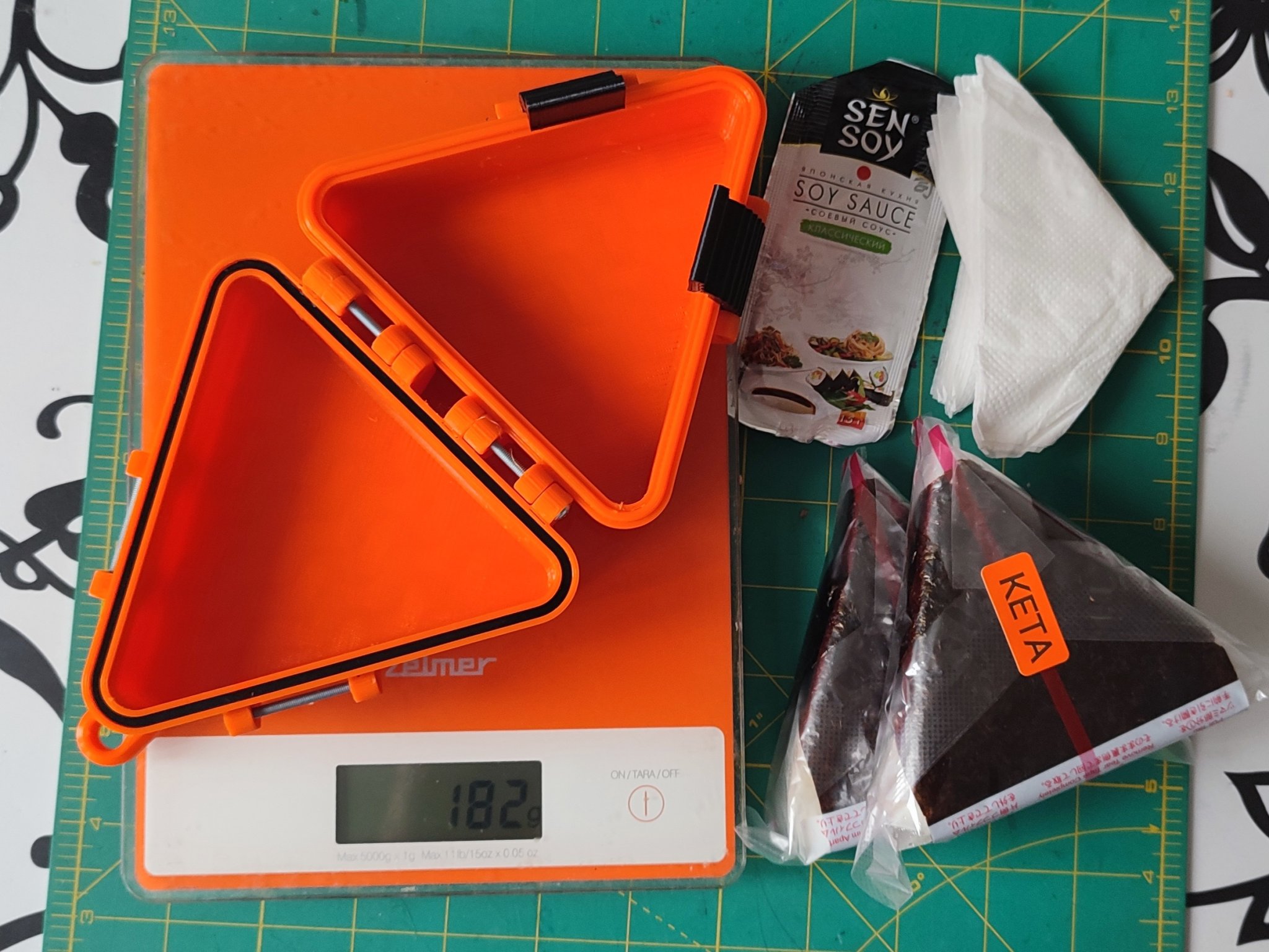 Tôi thật sự yêu onigiri, và tôi thích mang chúng theo như một món ăn vặt hoàn chỉnh. Nhưng thường thì tôi gặp phải một vấn đề: nó không vừa với các hộp hình chữ nhật, hoặc hộp chiếm quá nhiều không gian. Và tôi đã quyết định tạo ra một hộp dành riêng cho onigiri. Kích thước được tính toán cho onigiri làm bằng bộ onigiri kit của tôi, cộng với nori, cộng với bao bì. Hộp dễ dàng chứa hai onigiri, một gói xì dầu, một khăn ướt/khô.