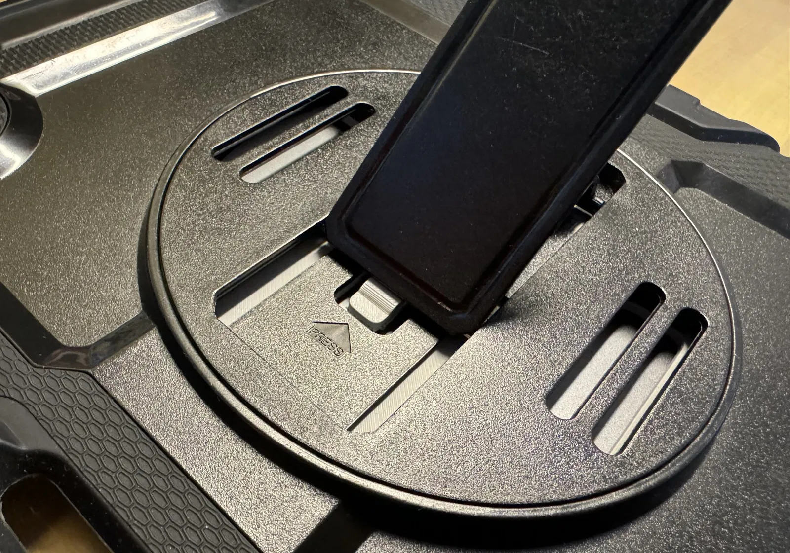 Thiết kế thay thế này đặt tab đỡ đế đứng trên tấm trong của bao da, cho phép tab dày hơn, giảm khả năng hỏng hóc. Tab vẫn đủ mỏng để dễ dàng gắn và tháo rời đế đứng.