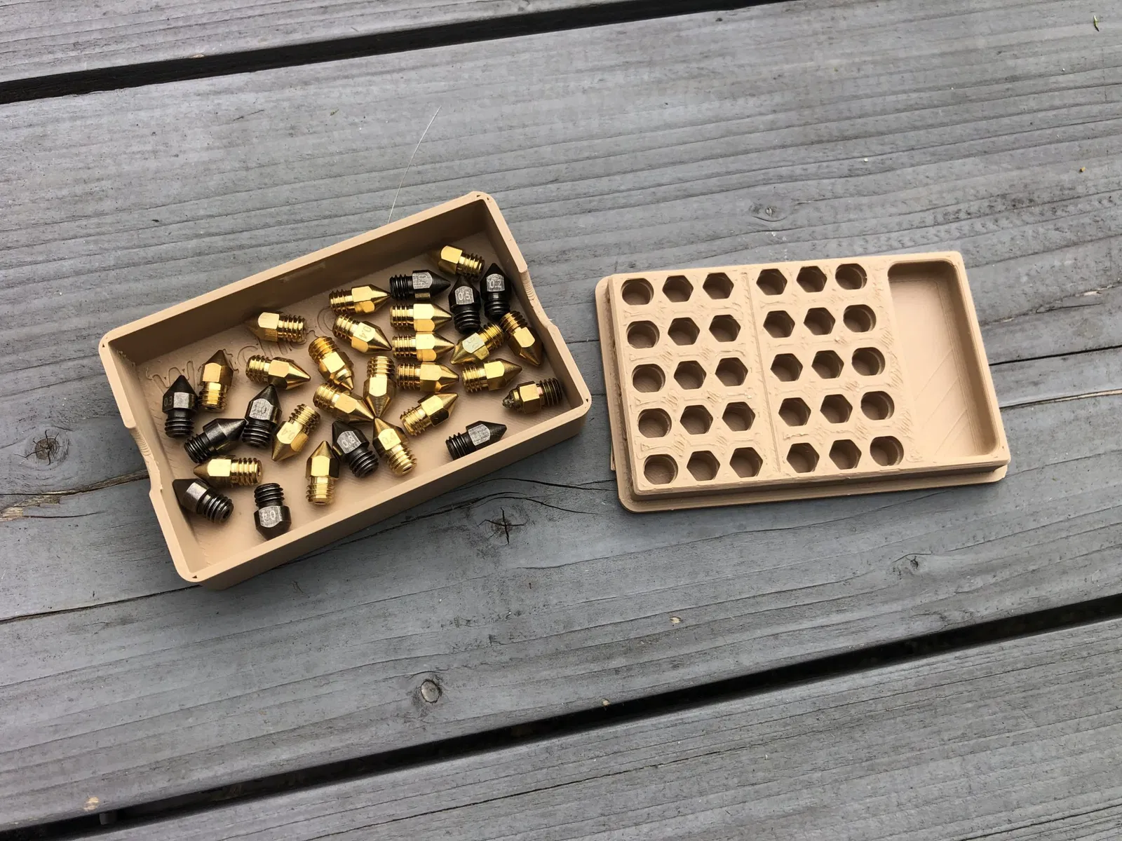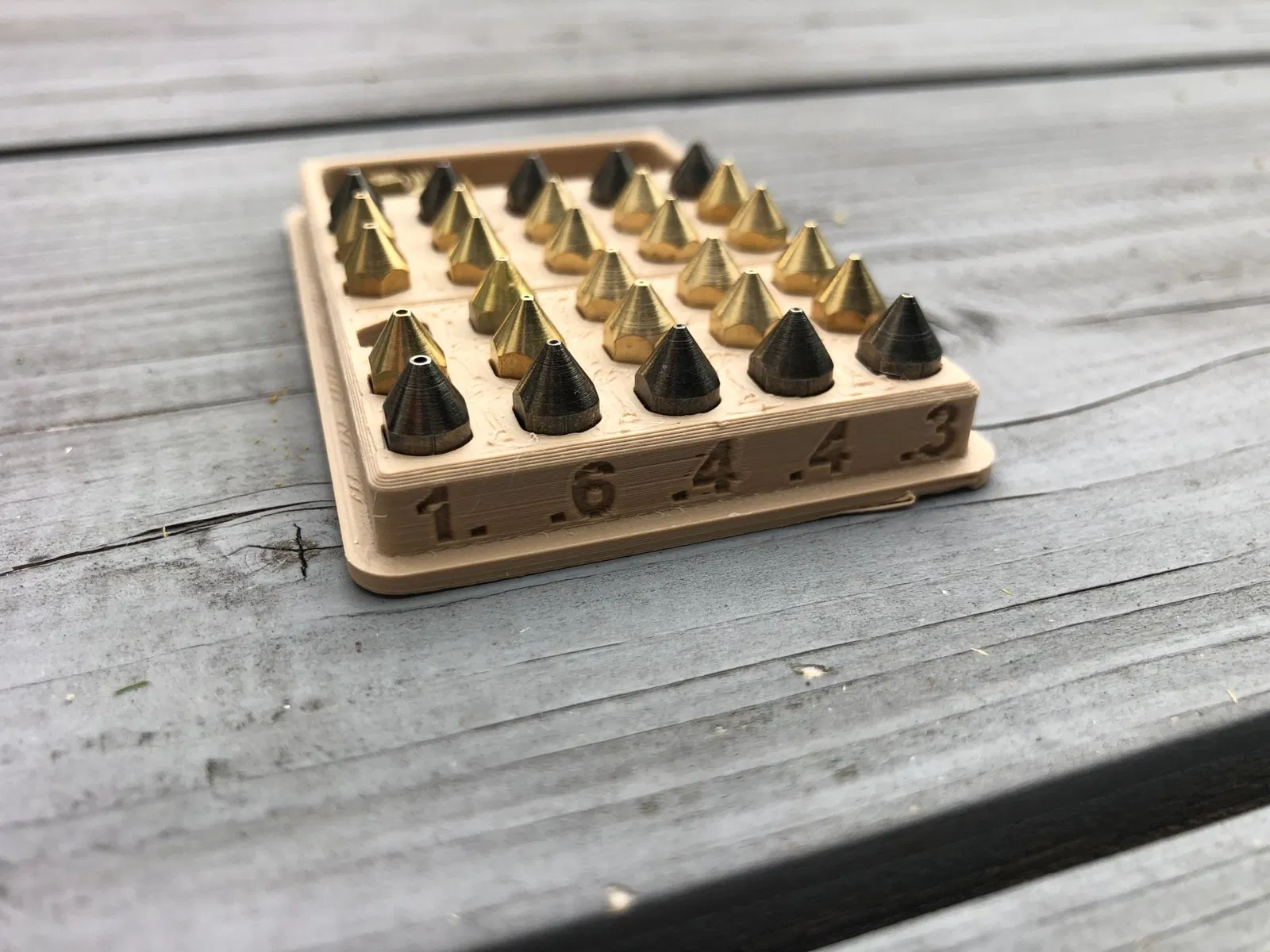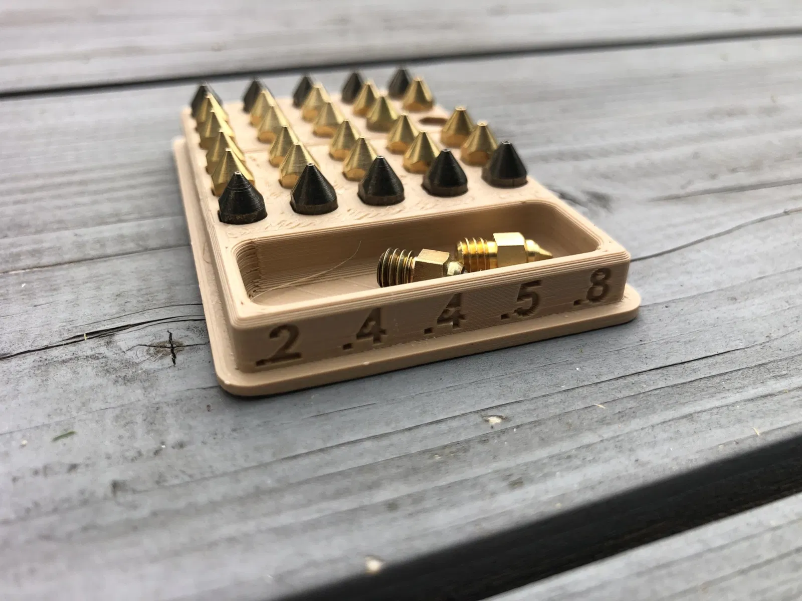 Đây là một khay vòi, có thể chứa 30 vòi. Nó cũng có không gian để lưu trữ vòi thêm. Các dấu hiệu cho kích thước vòi bạn đang sử dụng nằm ở bên cạnh mô hình. Nó được khuyến nghị in nắp với phần trên quay xuống. Nắp khít vào và dễ dàng tháo ra.