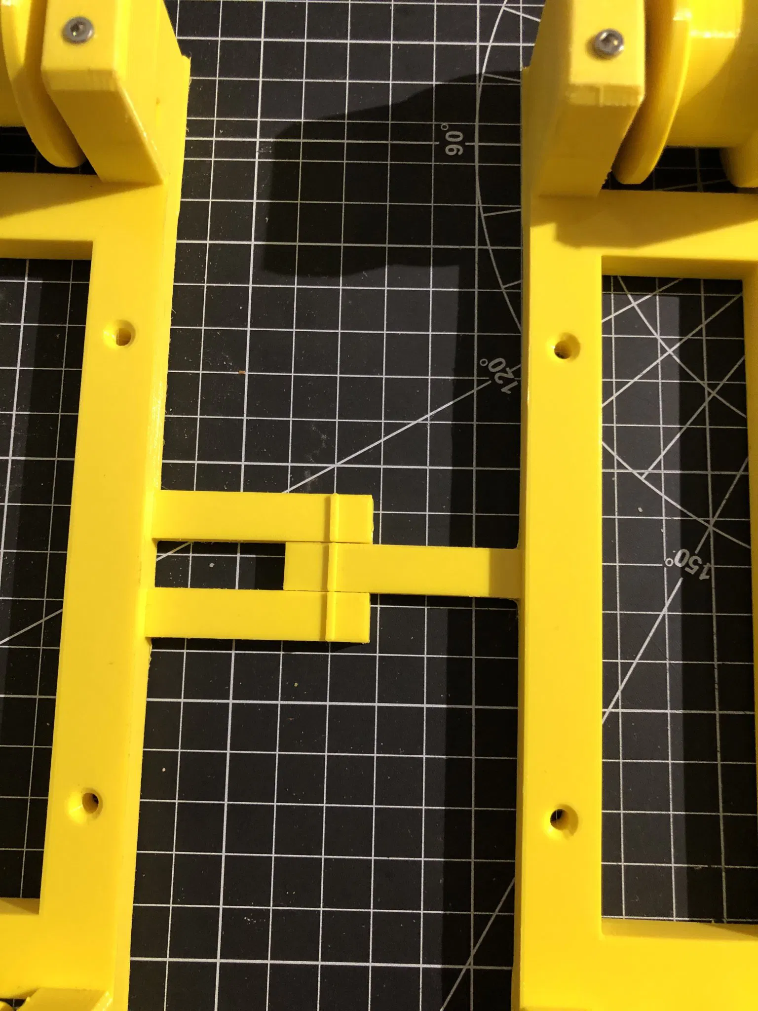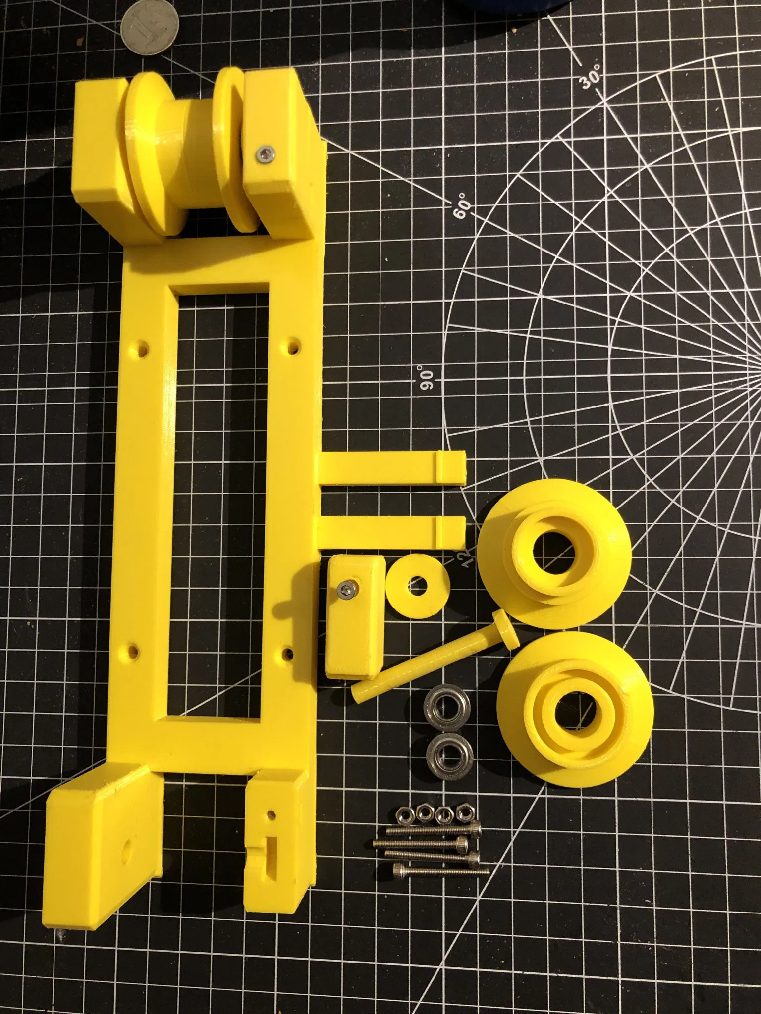 Bushing đặt ở phía bu lông trên trục. Trục được in ở 40% hai mảnh con lăn. Căn chỉnh và không cần chà nhám.