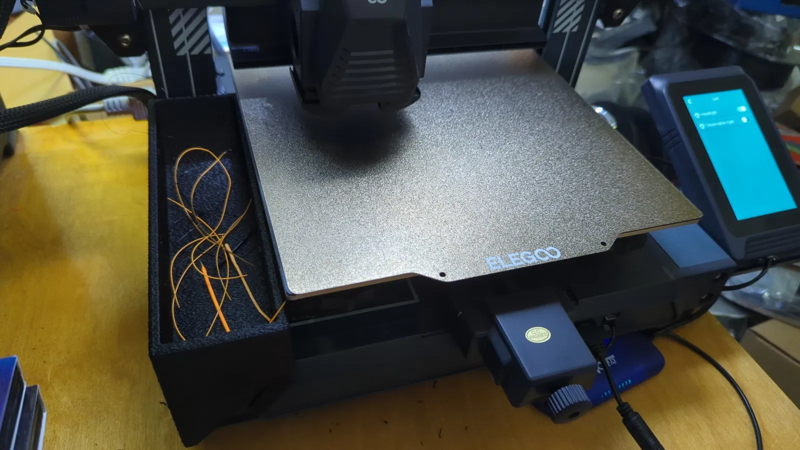 Một thùng chất thải hình chữ nhật rất tiện dụng chộp vào phía bên trái của Elegoo Neptune 4 hoặc Neptune 4 Pro.