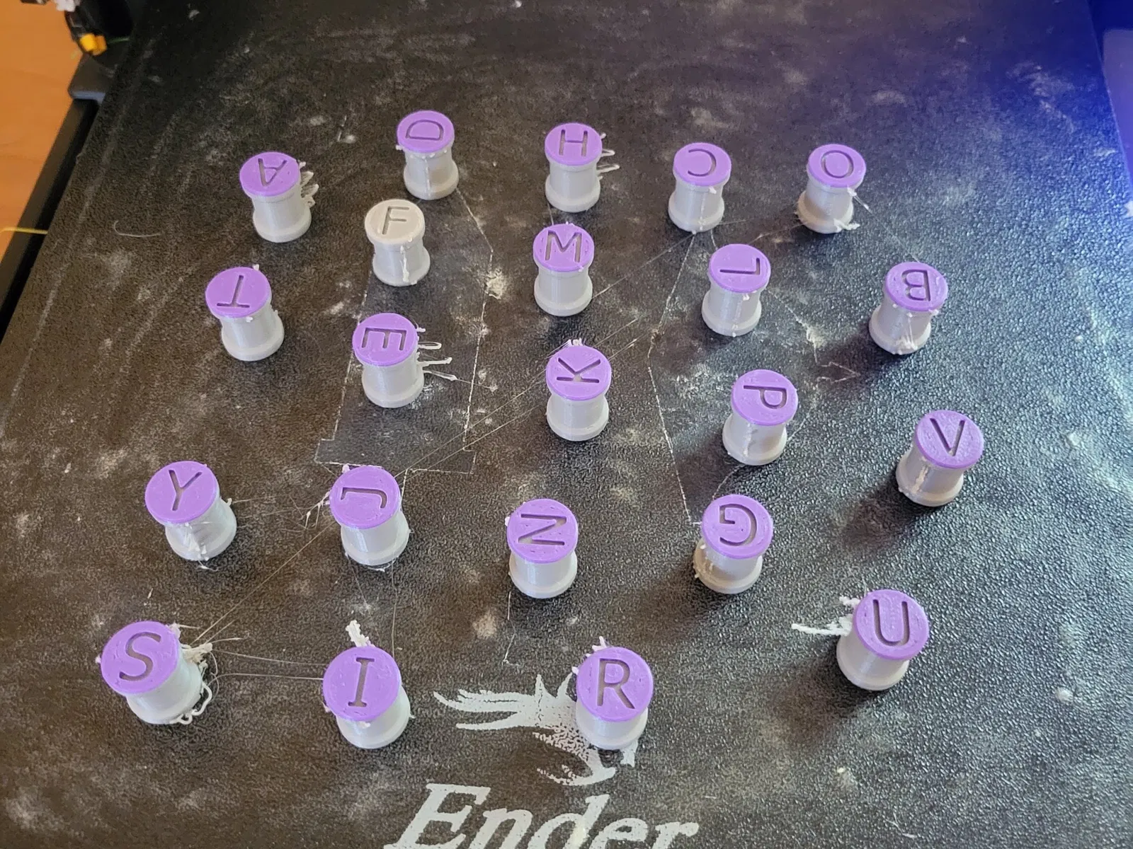 Mã thông báo chữ cái có kích thước 12 mm cho D & D hoặc các TTRPG khác. 22 chữ cái ở một bên và một X ở bên kia.