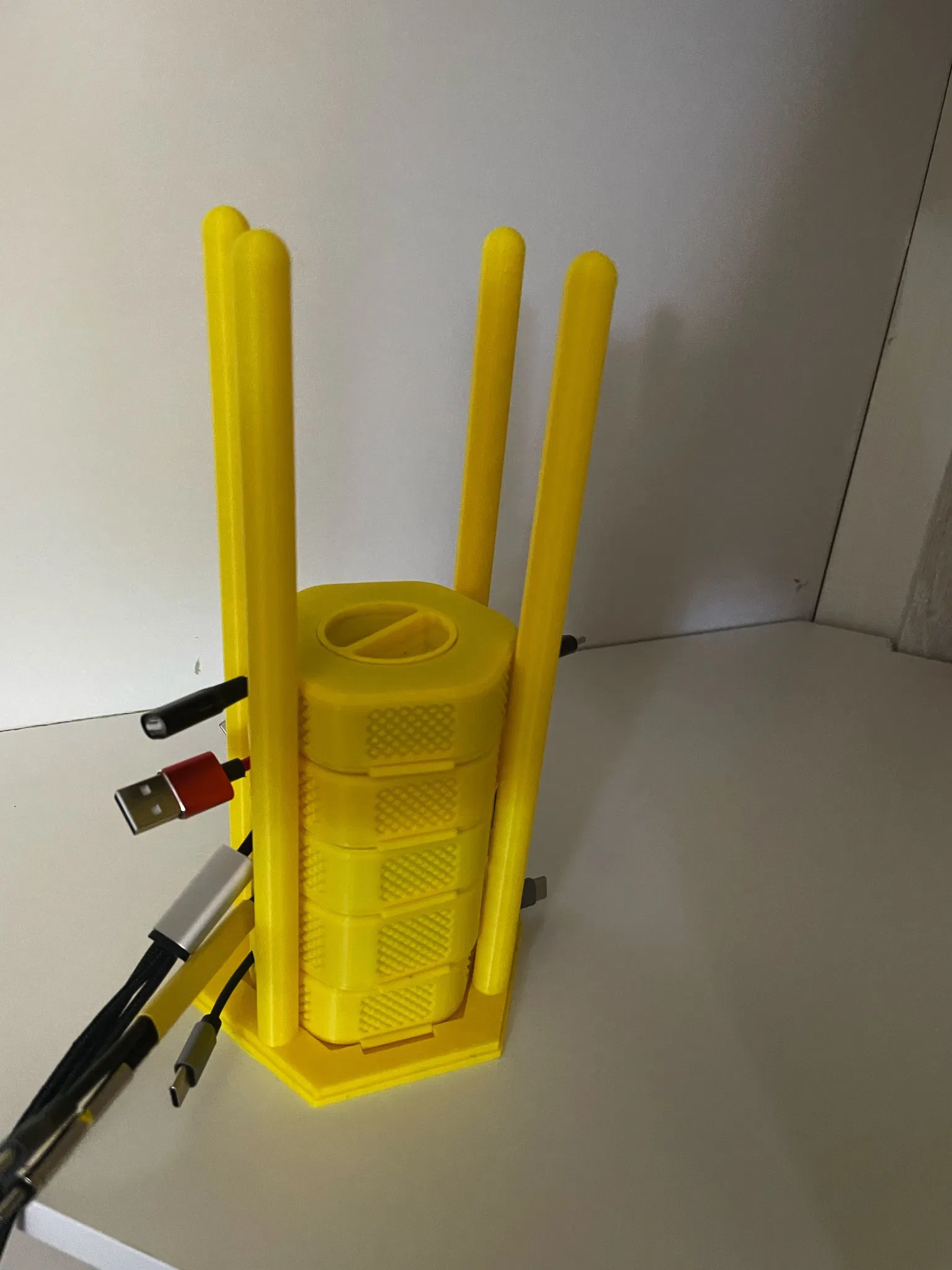 Một giá đỡ đơn giản cho máy cuộn dây cáp của @squinn. Được in bằng Bambu Labs Yellow ABS với độ dày lớp 0.2mm, 2 lớp tường và 7% độ đầy gyroid … có thể chứa 9 cuộn nhỏ hoặc 7 cuộn vừa (tôi chưa in cuộn lớn nào).