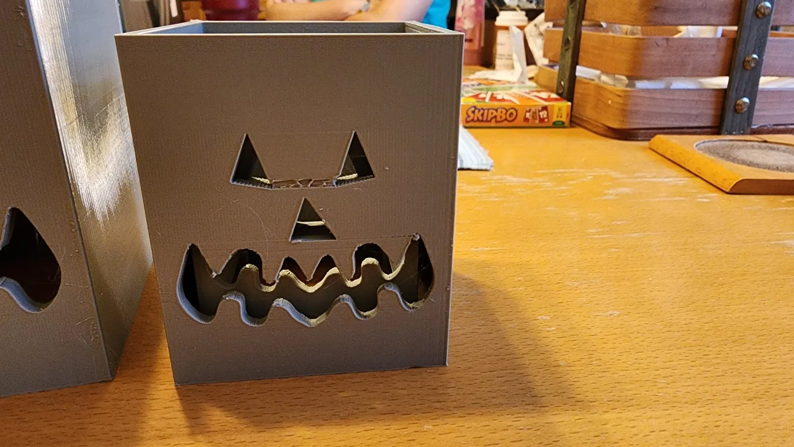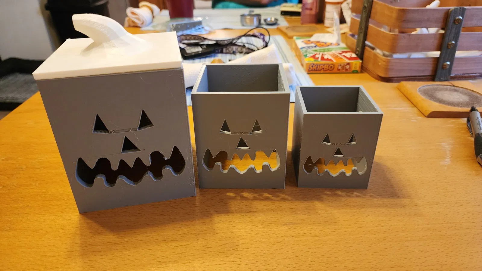 Tôi đã có ý tưởng này từ một khuôn mặt bí ngô cũ được vẽ trên một chiếc thùng gỗ. Tôi quyết định tạo ra 3 chiếc hộp, mỗi chiếc nhỏ hơn một chút so với chiếc trước và xếp chúng lại để tạo ra hiệu ứng 3D độc đáo. Tôi không có màu nhưng tôi đã chia sẻ một bức tranh có màu.