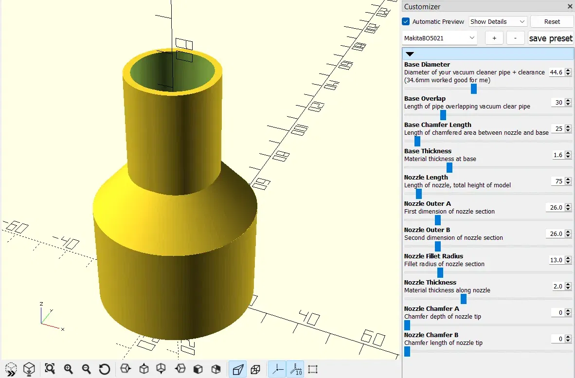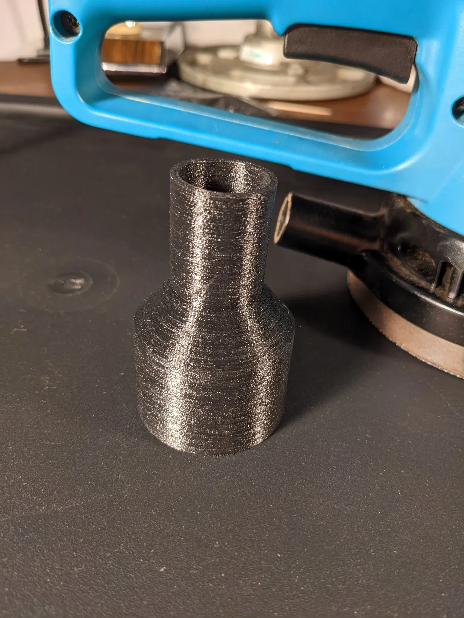 Đây là một bộ chuyển đổi cổng bụi cơ bản cho Makita BO5021 được tạo ra bằng cách sử dụng Công cụ Hút Bụi Tùy Chỉnh của Zivbot có sẵn trên Thingiverse. Tôi đã bao gồm một hình ảnh về các cài đặt mà tôi đã sử dụng làm điểm khởi đầu cho việc tùy chỉnh nếu bạn muốn kích thước ống hoặc độ taper khác. Tôi muốn tạo ra một phiên bản từ đầu gắn vào tay cầm và lệch ống một chút, nhưng cái này hoạt động khá tốt cho đến bây giờ.