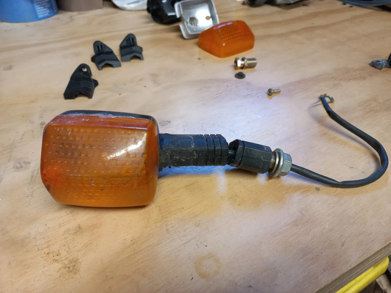Dưới đây là một dây nối đèn báo rẽ cho 500cb PC26 và PC32. Tôi đã lấy lại hình dạng nguyên bản bằng cách rút ngắn nó đi 46mm. Nó hiện có kích thước 34mm (mặt gắn/bên trong chén đèn báo rẽ).