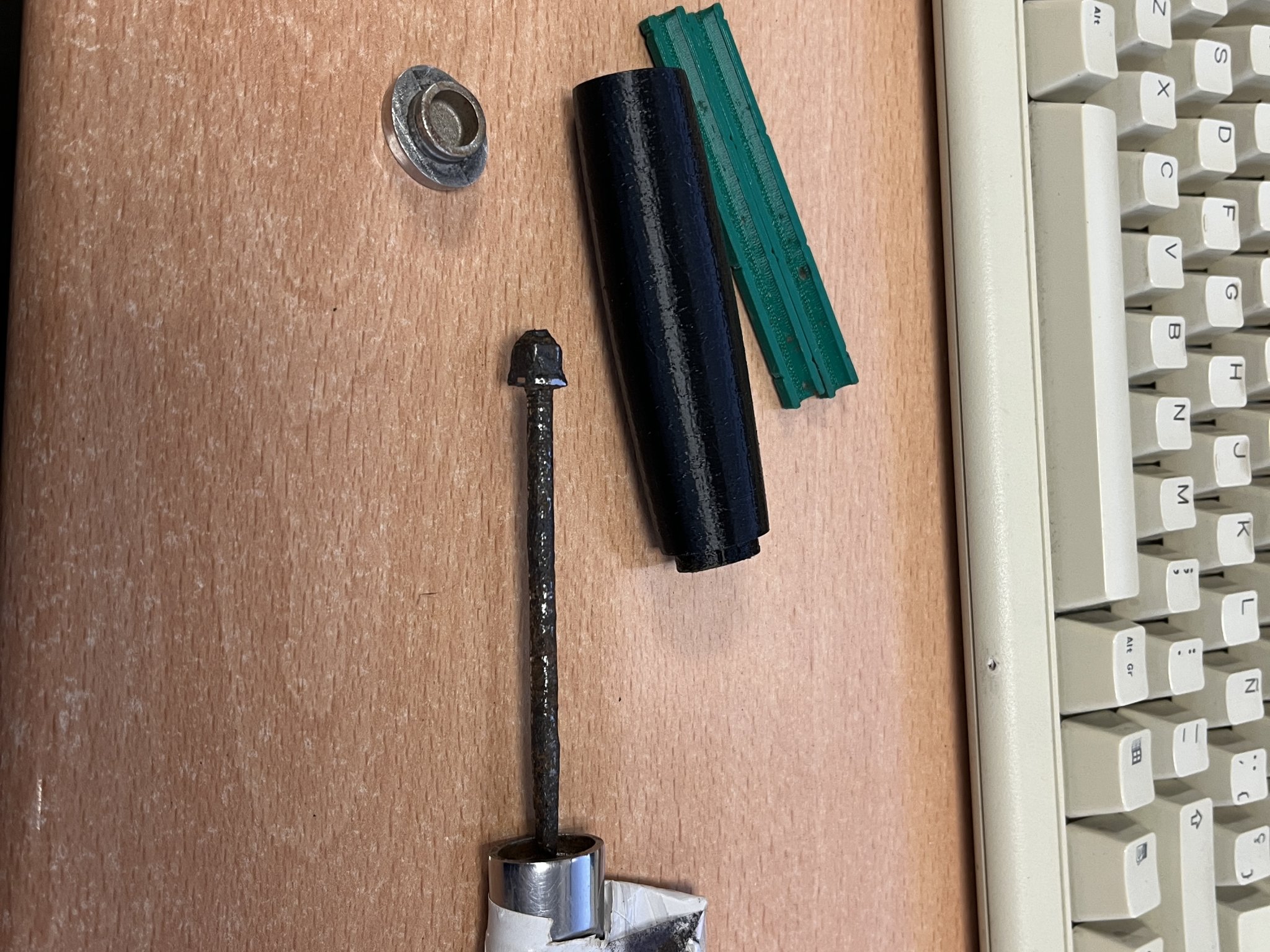 Khi tôi tháo bỏ tay cầm cũ, tôi thấy một thanh ren M5 với một vài đai ốc mà tôi không thể làm sạch, vì vậy tôi đã điều chỉnh. Giải pháp sử dụng ba bộ phận dễ dàng được dán bằng epoxy để tạo ra một liên kết chắc chắn.