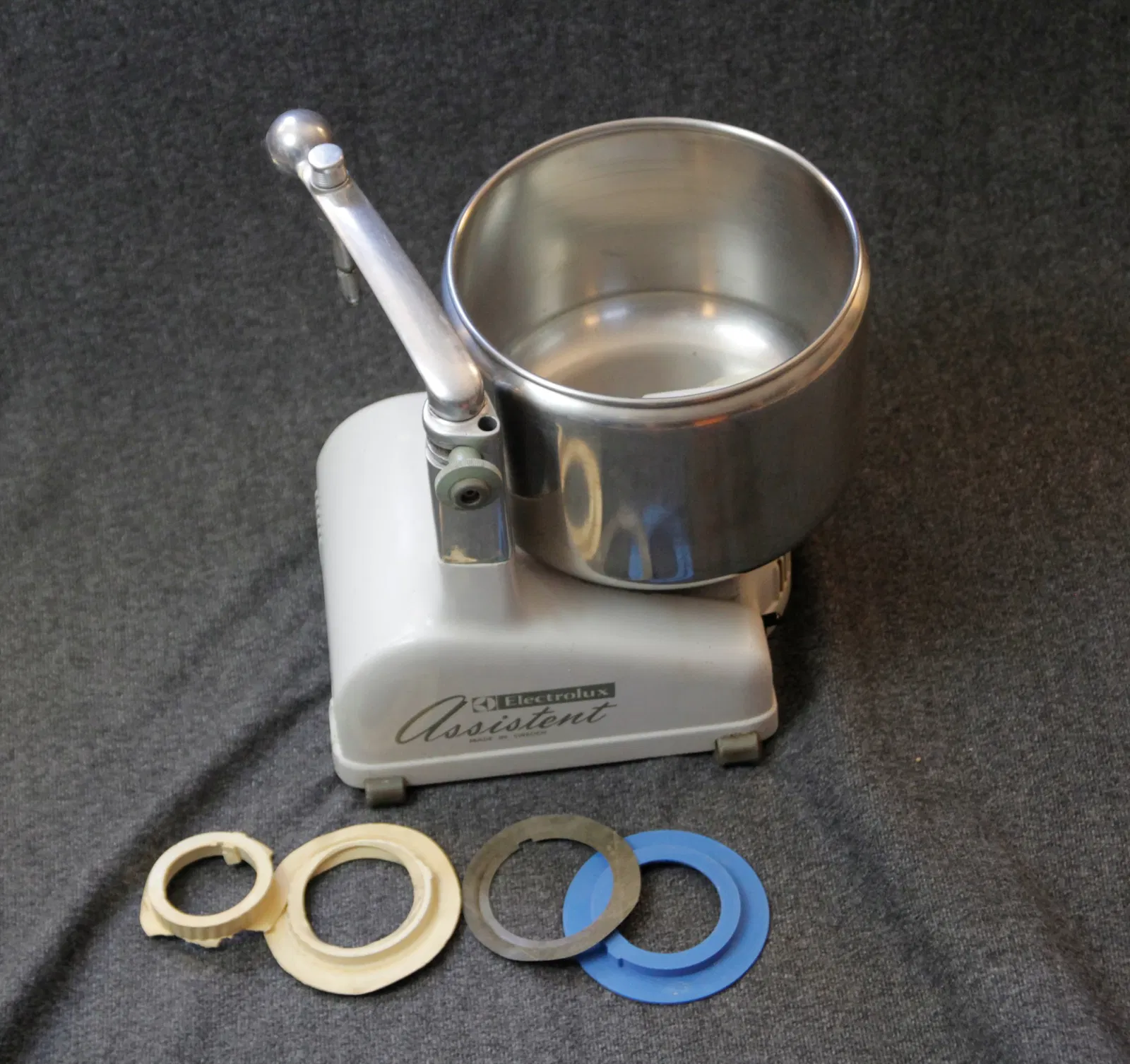 Các máy trộn trợ lý Electrolux cũ từ những năm 1940 được xây dựng như những chiếc xe tăng và nhiều chiếc vẫn đang được sử dụng cho đến ngày nay. Chiếc trong bức ảnh được truyền lại cho tôi từ bà tôi và theo như tôi hiểu, nó được mua trong thời trẻ của bà vào những năm 1950 hoặc 1960. Tên mẫu là N4 nhưng nó có động cơ 400w và một số nguồn dường như gọi chiếc này là n4d. Dòng máy trộn này vẫn được sản xuất cho đến ngày nay nhưng giờ được gọi là “Ankersrum" và nhiều bộ phận vẫn tương thích. Tuy nhiên, máy có giá lên tới 1000 USD tùy thuộc vào mẫu mã và nơi bạn mua.
