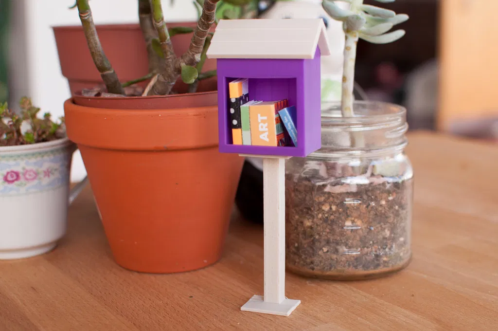 Một thư viện thu nhỏ in 3D và có thể chia sẻ cho những người yêu thích đọc sách, sách, chia sẻ và các Thư viện Tự do Thu nhỏ (Little Free Libraries). Hãy in một cái cho riêng bạn hoặc để chia sẻ tại Thư viện Tự do Thu nhỏ gần nhà bạn nhất. Bạn cũng có thể sử dụng nó như một chặn sách, một thư viện cho nhà búp bê, hoặc để đựng đồ trang sức và các vật dụng nhỏ lặt vặt. Mô hình được làm theo tỷ lệ 1 inch dựa trên các bản thiết kế được tìm thấy tại http://littlefreelibrary.org/builders/. Thư viện Tự do Thu nhỏ này sẽ là một món quà in 3D tuyệt vời cho mọt sách và những người yêu thích nền kinh tế chia sẻ. Đây là bản đăng lại của dự án gốc của tôi từ năm 2014 trên thingiverse.