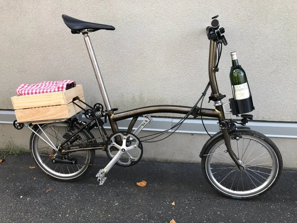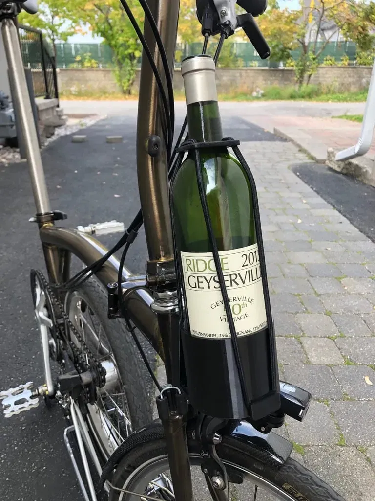 Người mang chai rượu cho xe đạp Brompton. Nó vừa vặn trên khối phía trước. Cần khoảng 90 cm dây thun đàn hồi để hoàn thành.