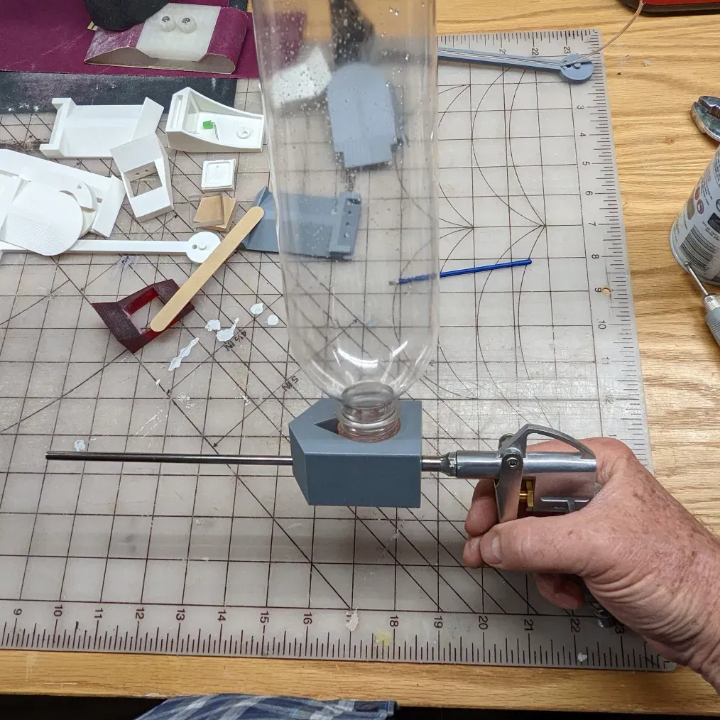 Mô hình này cho phép bạn tạo ra một máy phun truyền thông với chi phí thấp từ một chai soda và một khẩu súng khí nén giá rẻ. Kết quả in tạo ra một khối vững chắc có thể được sử dụng để làm một máy phun truyền thông nhỏ tuyệt vời cho những công việc rất nhỏ và sử dụng thỉnh thoảng. LUÔN LUÔN sử dụng các biện pháp an toàn khi làm và sử dụng thiết bị chạy bằng khí nén. Phun truyền thông là một quá trình rất nguy hiểm. Hãy chắc chắn rằng bạn biết cách thực hiện một cách an toàn trước khi thử nghiệm. Khi sử dụng máy phun, hãy bắt đầu với áp suất khí thấp nhất có thể và tăng dần đến áp suất phù hợp với bạn. Áp suất quá cao sẽ khiến thiết bị này bị hỏng và có thể dẫn đến chấn thương. LUÔN LUÔN đeo thiết bị bảo vệ đầy đủ khi làm và sử dụng một thiết bị như thế này.