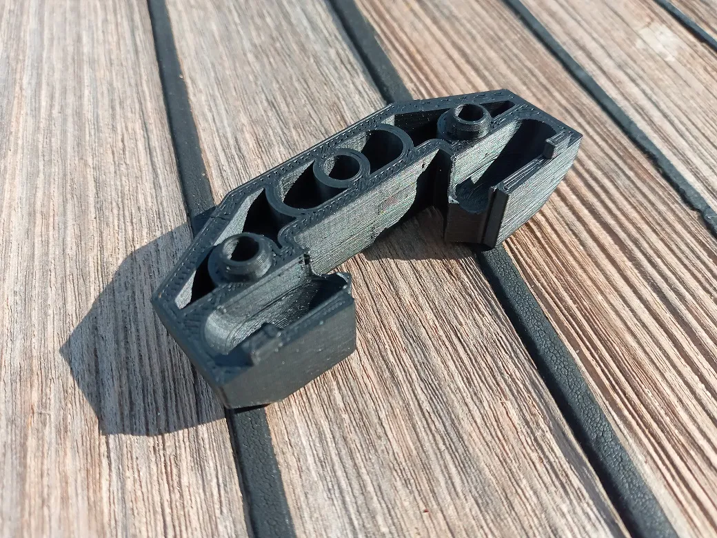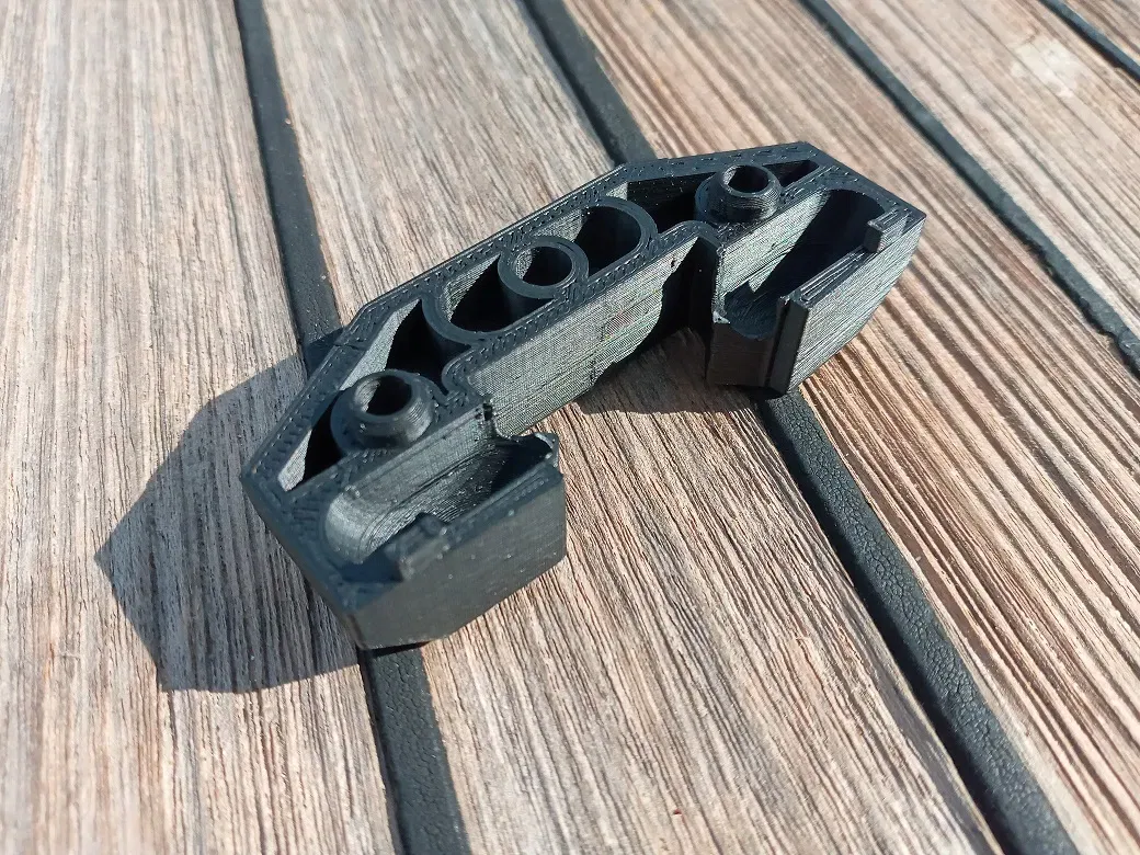 Tôi đã in phần này bằng ABS cách đây bốn năm và nó vẫn hoạt động, nhưng, vì nó ở bên ngoài, tốt hơn là in nó bằng ASA. Để làm cho nó bền hơn, nó được in với 100% độ đầy. Nó chỉ có hỗ trợ ở các phần nhô ra ngang nơi có các ốc vít được đặt.