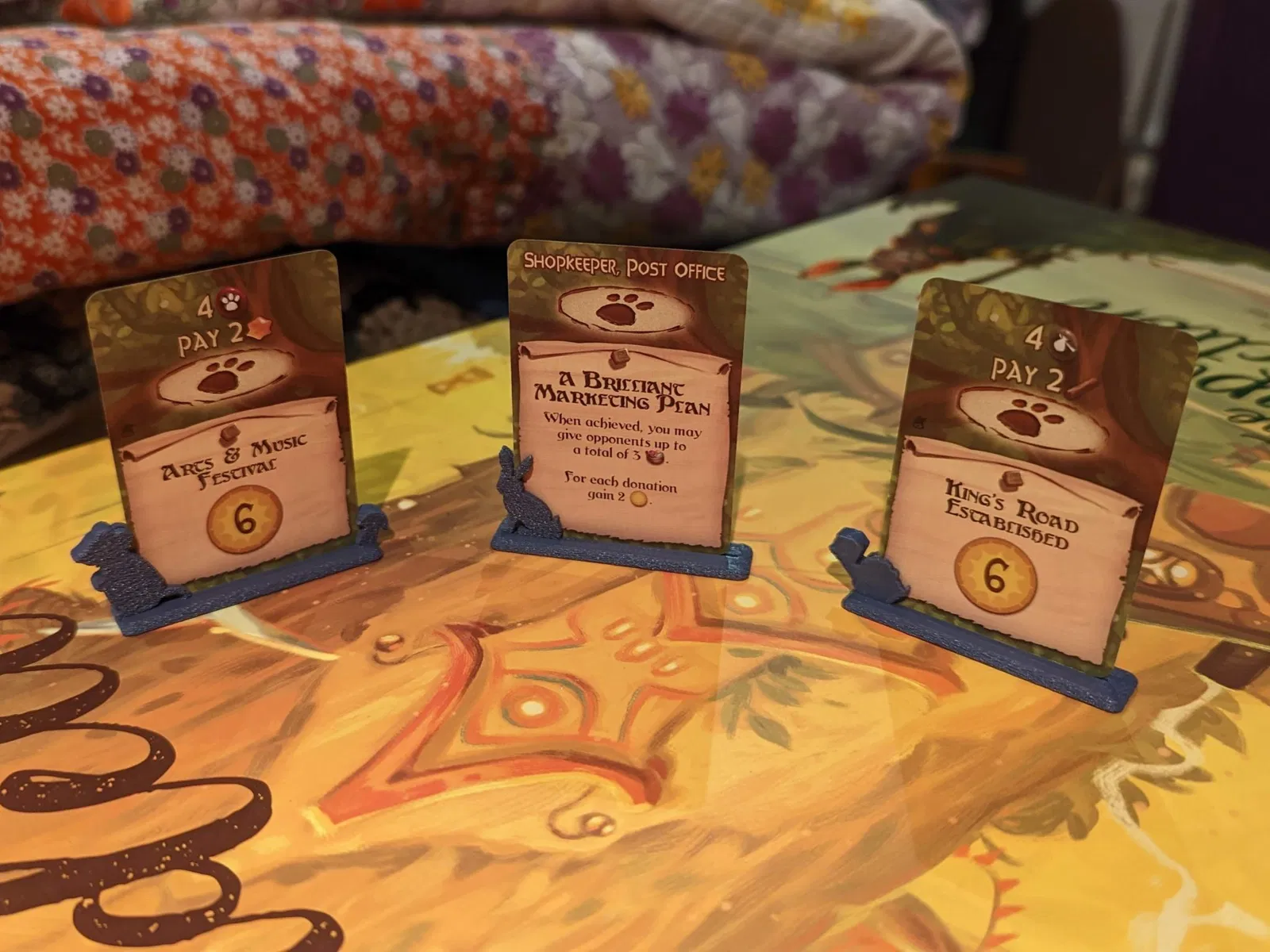 Chỉ một vài giá đỡ cho các thẻ sự kiện đặc biệt. Tôi nhận thấy rằng khi đặt phẳng trên cây, chúng khó đọc hơn. Những cái này giữ cho các thẻ 66x44mm đứng thẳng, nhưng đủ nhỏ để không che khuất văn bản. Bất kỳ loại filament nào cũng được, và bạn sẽ cần một hỗ trợ nhỏ cho đầu của nấm. Bạn có thể cần phải chạy một con dao xacto qua khe nếu có bất kỳ cục bẩn hoặc sợi nào. Cập nhật: 2023-02-25: Đã thêm giá đỡ Nhím! Ngoài ra, nếu bạn có Bộ sưu tập Hoàn chỉnh Everdell, đây là một bộ chứa token cho nó: <>