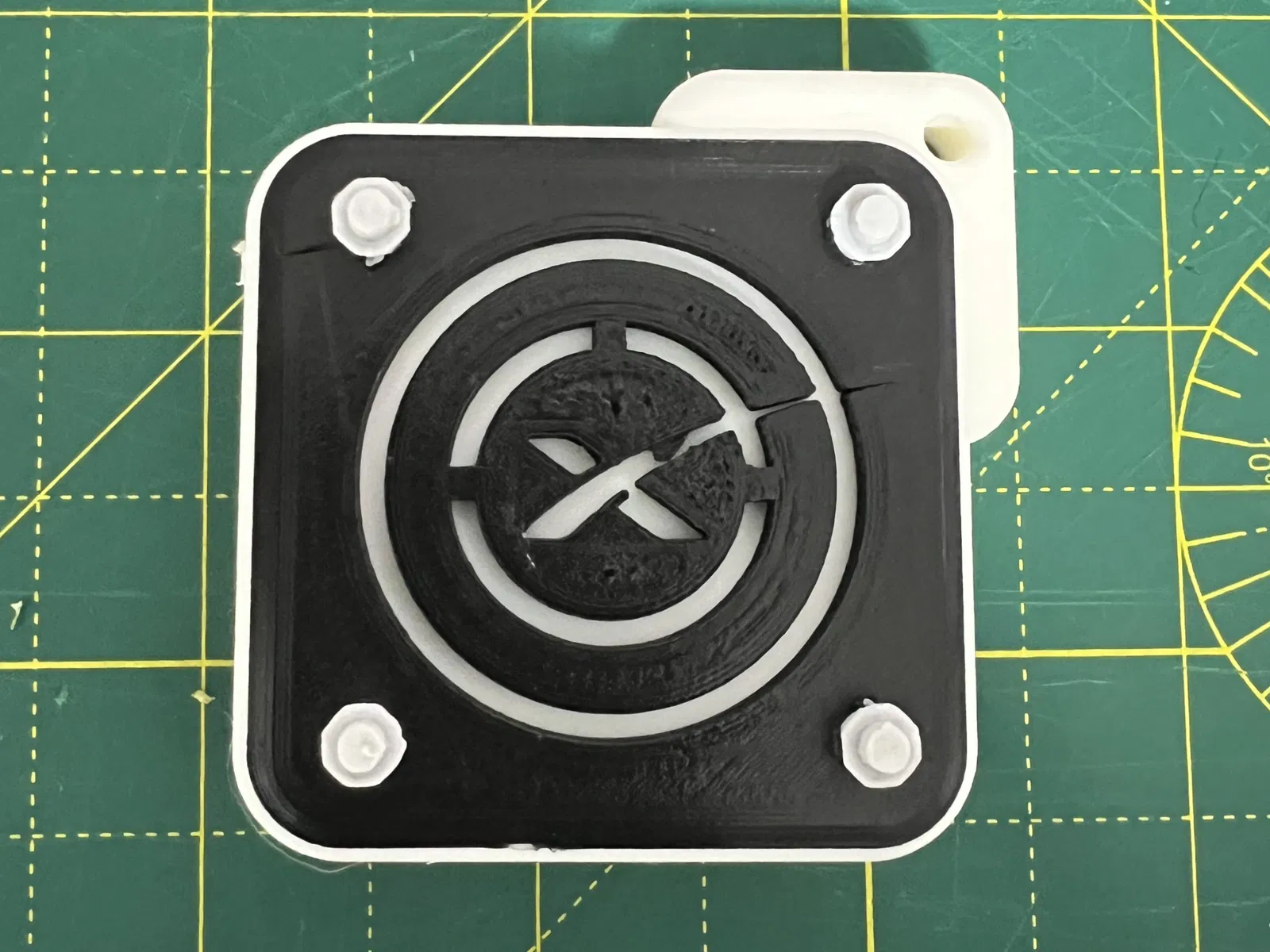 Một móc chìa khóa dày với logo Space X trên đó.