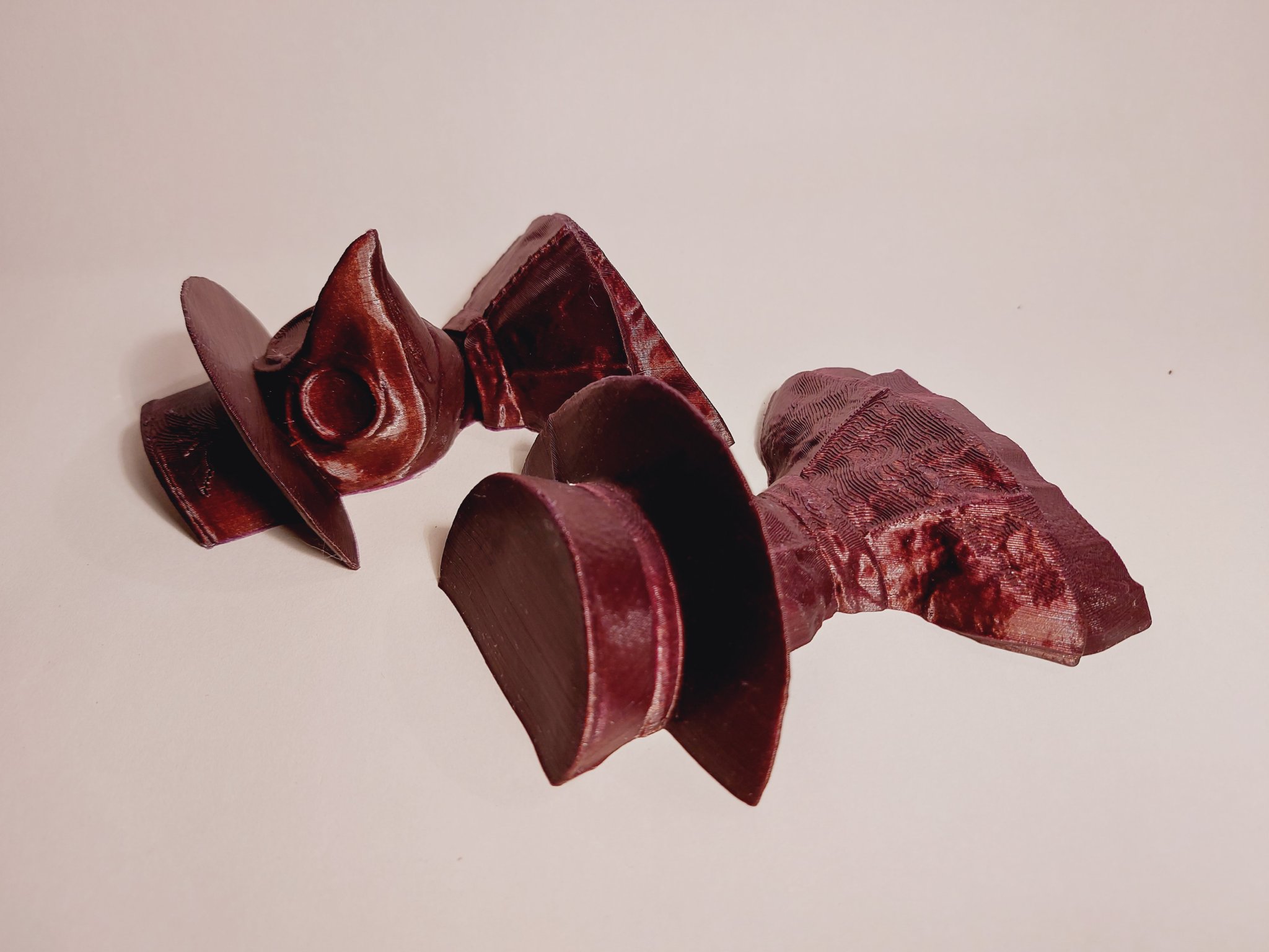 Mô hình gốc chủ yếu được thiết kế để in trong một cắt đặc biệt thành 3 phần - thân, mỏ và mũ. Nhược điểm của cắt gốc này là cần phải sử dụng giá đỡ cho mũ. Vì vậy, tôi đã tạo ra một cắt thay thế thành hai nửa mà không cần giá đỡ. Tôi cũng đã làm các biến thể nhỏ hơn với lỗ gắn tùy chỉnh (tỷ lệ) (bạn có thể sử dụng các đoạn filament cho những cái này).