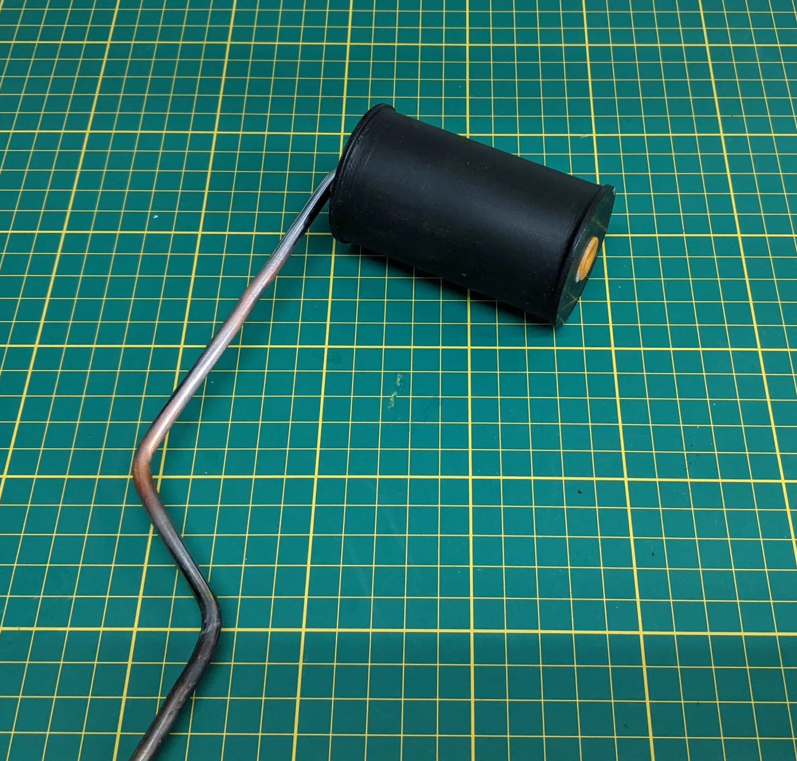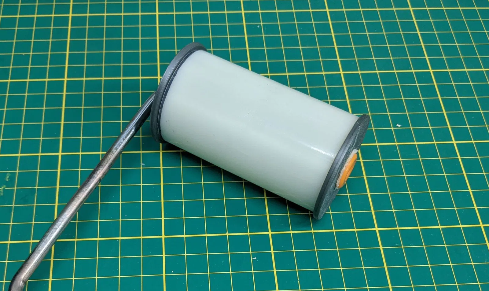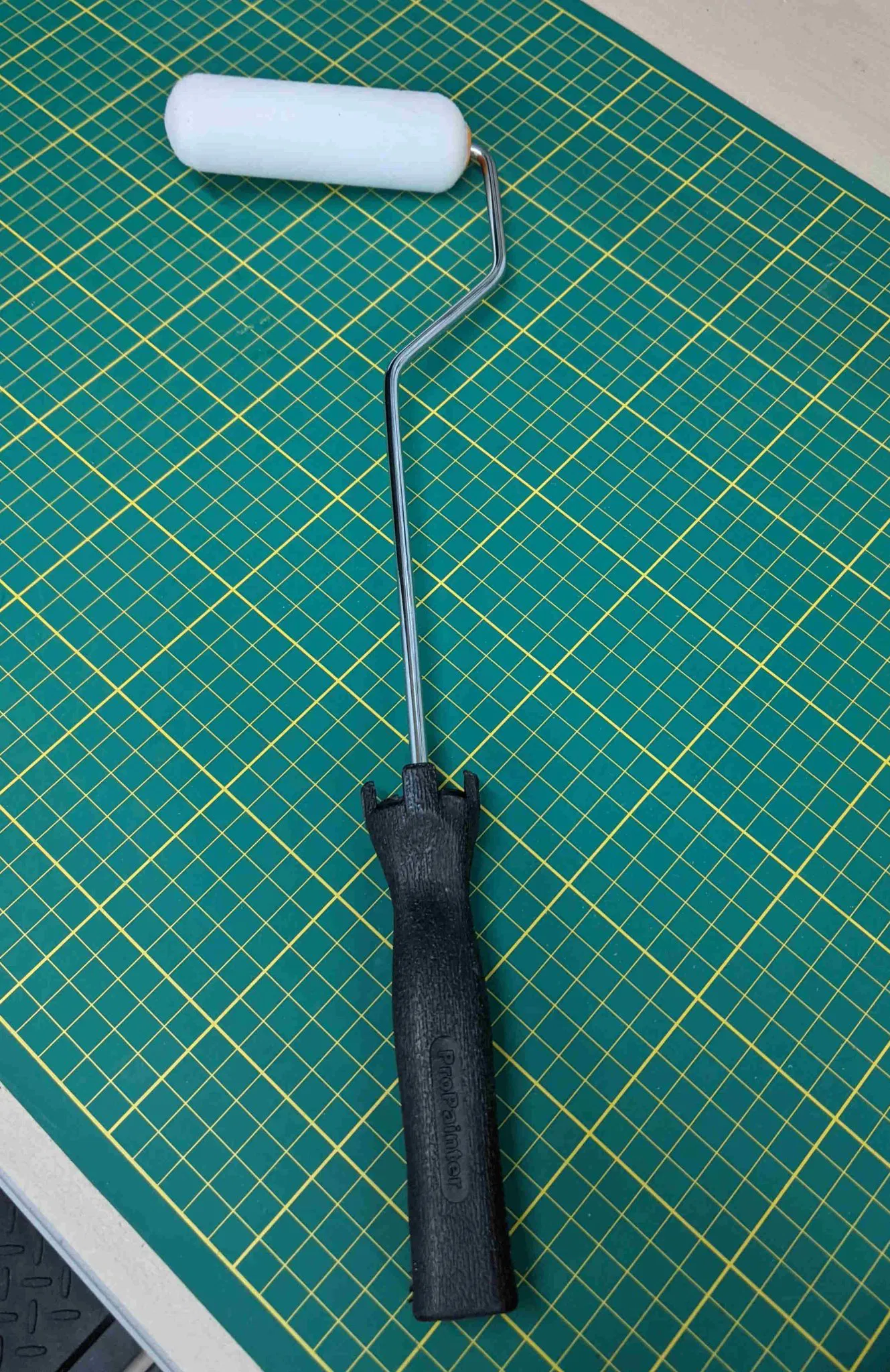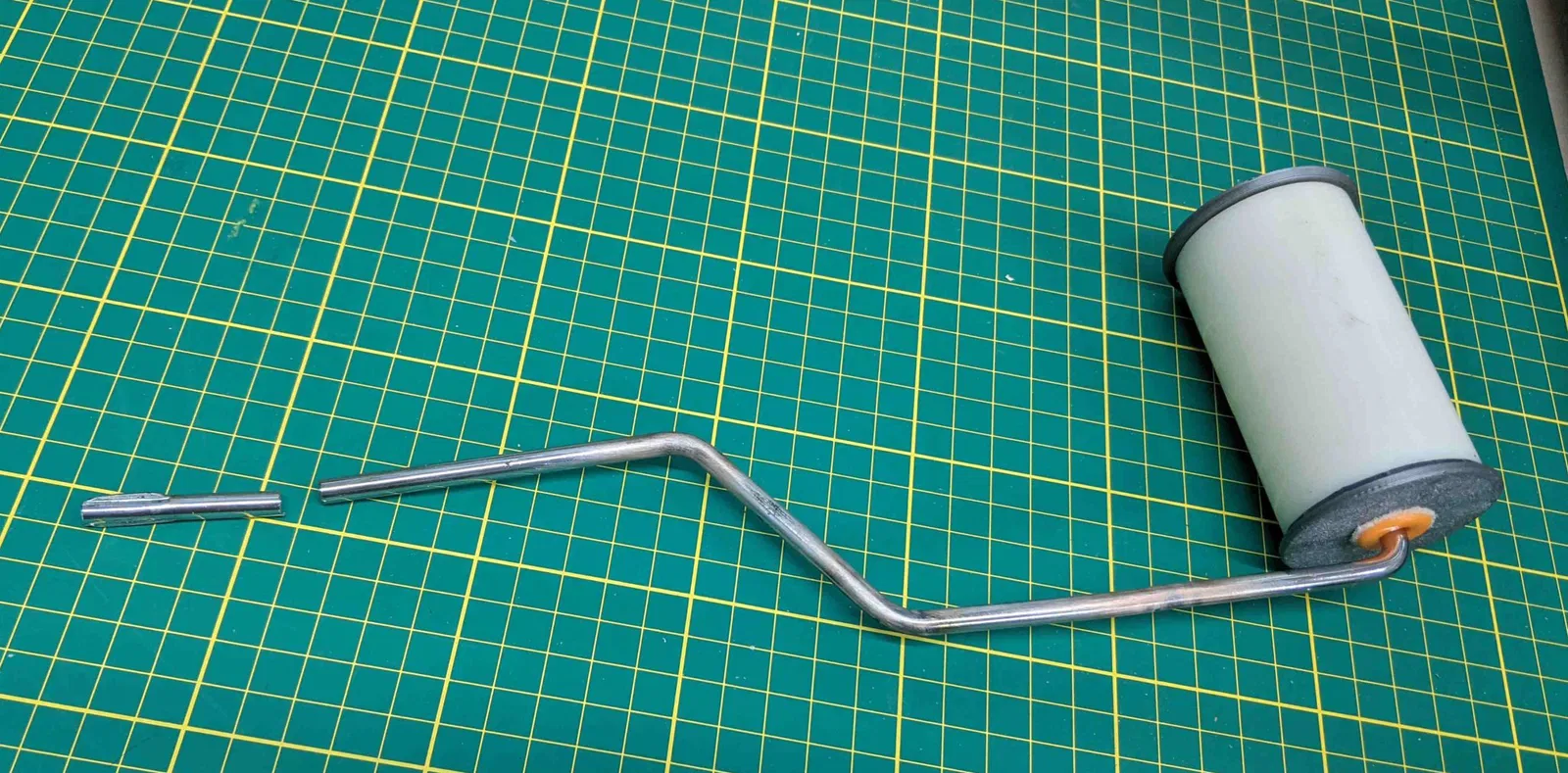 - một con lăn sơn bằng bọt cao cấp 4” (mini), phiên bản tay cầm dài để nó có thể giữ một cuộn. Những cái này có sẵn từ các nơi như Home Depot, Harbour Freight và trực tuyến. Tôi đã mua cái của tôi tại Dollarama. Hãy nhìn vào tay cầm và chiều dài trong các bức ảnh, những cái đó tôi biết sẽ hoạt động. Đường kính trục là 5.73mm (0.225") sẽ vừa vặn vào giá đỡ.