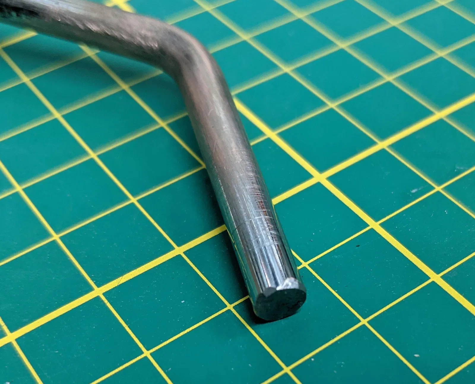 Để uốn thanh dễ dàng hơn, tôi đã làm nóng các khu vực bằng một ngọn đuốc propane nhỏ cho đến khi thép chuyển sang màu nâu nhạt và dễ dàng uốn tại chỗ đó bằng tay. Lần thử nghiệm đầu tiên của tôi tôi đã sử dụng búa và một cái kẹp để thực hiện việc uốn và duỗi thẳng. Cách này hoạt động nhưng kém chính xác hơn nhiều.