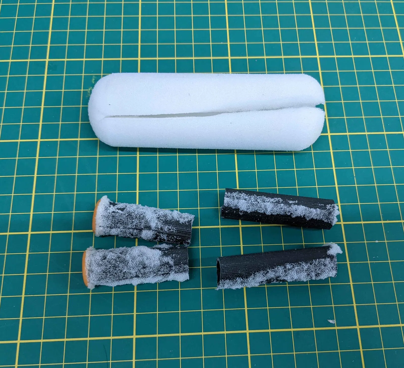 - Đối với mỗi con lăn bằng bọt, cắt bọt ra khỏi ống bên trong và cắt ống ngắn lại, quay về chỗ phần gắn vào thanh. Giữ lại miếng bọt này, bạn có thể muốn một mảnh trong số đó để giảm chuyển động của cuộn nếu nó lăn quá dễ dàng theo ý bạn.