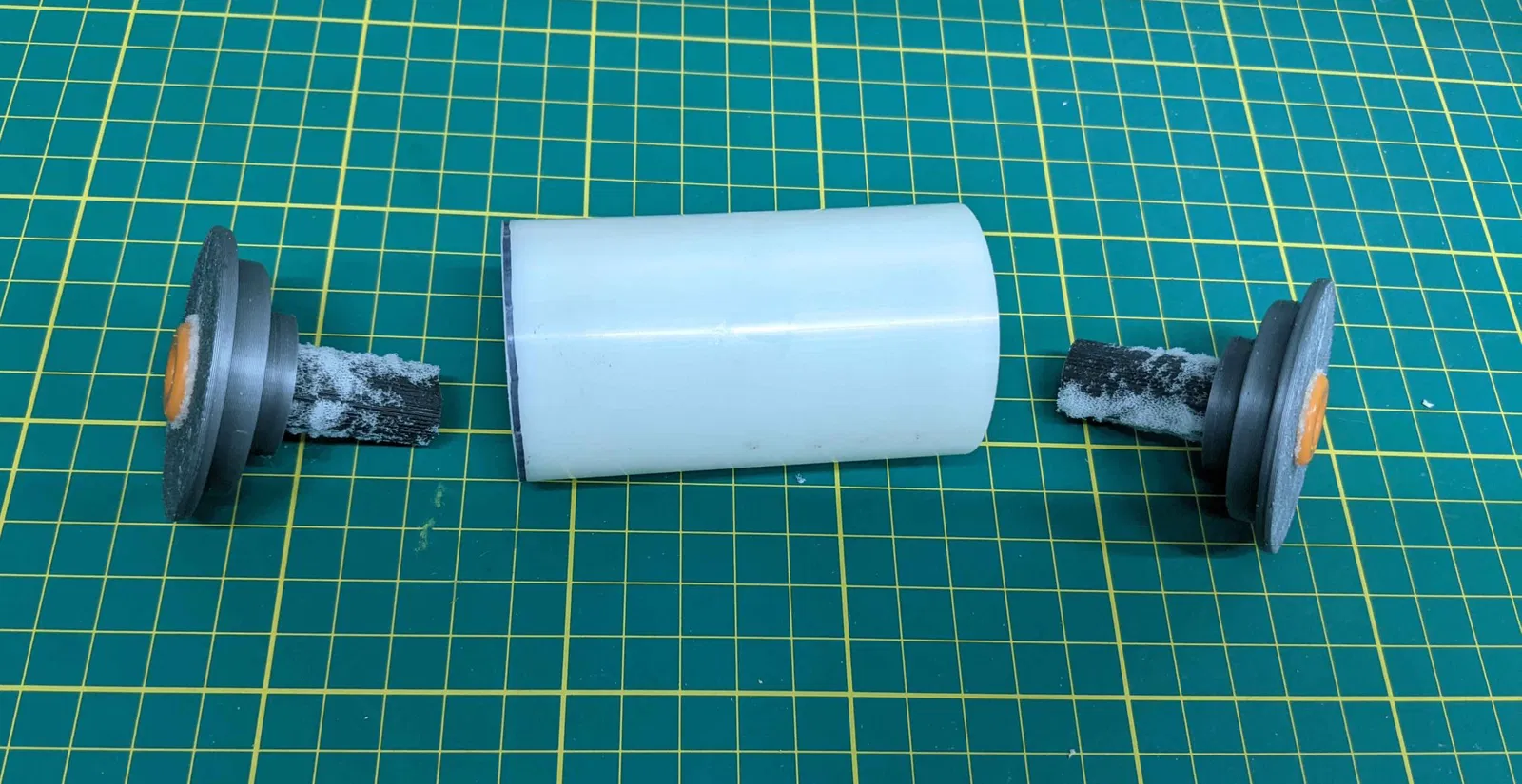 - Một đoạn ngắn (80 đến 85mm) của ống ABS 1 ½” hoặc 1 ¼”. Ống 1 ¼” là ưu tiên hơn vì nó cho phép các vành lớn hơn một chút ở đầu để giữ cho con lăn không bị rơi ra ngoài.