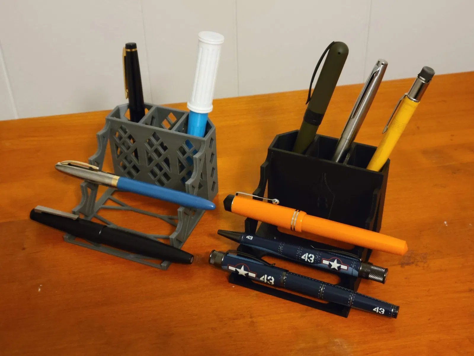 Một chân bút được thiết kế với lưu trữ dọc và ngang cho bút máy, hoặc các dụng cụ viết khác.
